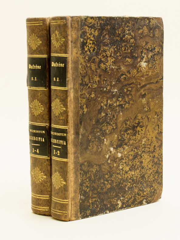 Quae antehacvarie tradidit et conscripsit P. M. Dufréne, Societatis Jesu Sacerdos, Addito Tractatu R. P. Rogaccii, ejusdem societatis, De Filiali et Familiari cum Deo consuetudine, Editio Nova, 4 tomes en 2 vol. in-8 reliure demi-basane à petits coins brun, Apud J. d'Haenens-Ramaut, Poperingis [ Poperinge ], 1820, VII-262 pp. 1 f. , 2 ff., 237 pp. et 1 f. ; 250 pp. et 2 ff., 2 ff., 320 pp.