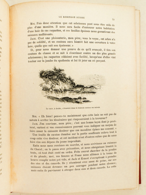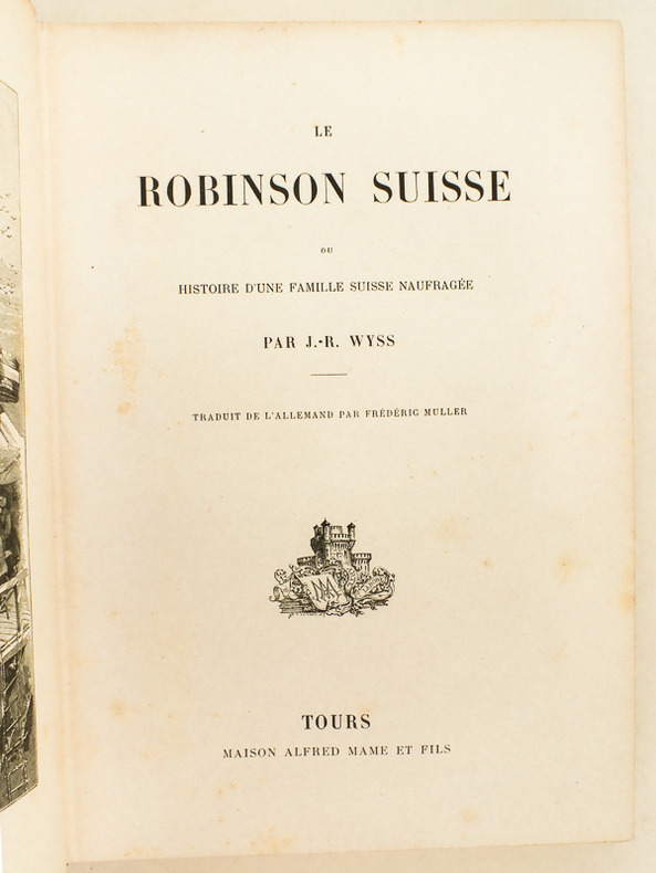 Par Johann Rudolph Wyss (1781-1830). Traduit de l'Allemand sur la dernière édition par Frédérich Muller. Orné de huit vignettes de M. de Sainson, gravées sur acier par Beyer.Tours, Alfred Mame et Fils - 1839 - iv, 308, et 272 pages. Deuxième édition.Reliure pleine basane de l'époque. Dos lisse orné et doré. Accident aux 2 coiffes inférieures. Accident aux dos des 2 volumes. Pas de rousseur. Assez bon état. Format in-12°(18x11).Fils du pasteur Johann David Wyss (1743-1818), Rudolph rédigea ce conte sous forme de roman et publia en allemand à Zurich en 1812 "Der schweizerische Robinson". Le récit est conçu par son père pour ses enfants et Rudolph passa à la postérité comme auteur de cet ouvrage.Le livre connaît un grand succès et sera constamment réédité. Jules Verne, grand admirateur du roman, a imaginé une suite. Son roman, titré Seconde Patrie paraît en 1900 et narre la suite des aventures de la famille Zermatt.