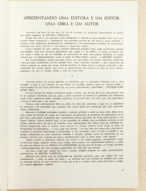 1 vol. in-8 br., Ediçoes Camina, Julho 1982, n° I, 218 pp.
