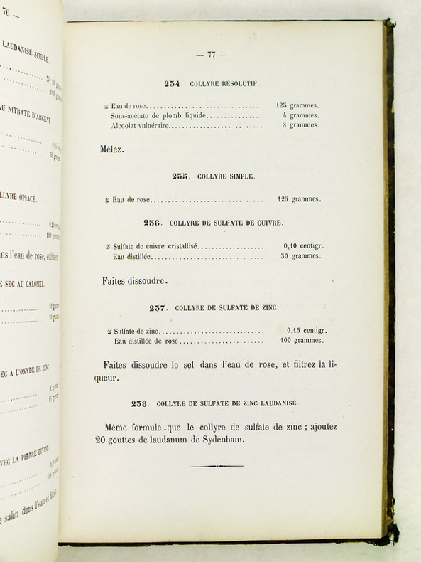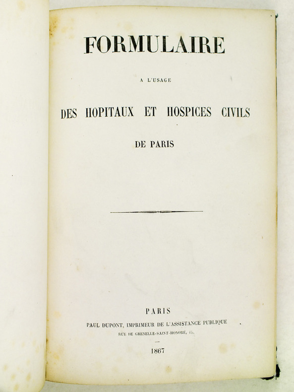 2 ff.n.ch., pp. V-XIV, un f.n.ch., 353 pp.Remplace le Formulaire de 1836, devenu extrêmement obsolète par suite de l'accroissement considérable de la matière médicale. Pharmacien en chef de l'hôpital des Enfants-malades, 1867-1885, puis directeur de la pharmacie centrale des hôpitaux de Paris, 1885-1897, Edme-Alfred Bourgoin (1836-1897) le rédigea avec la collaboration de Paul Constantin (1833-1896)