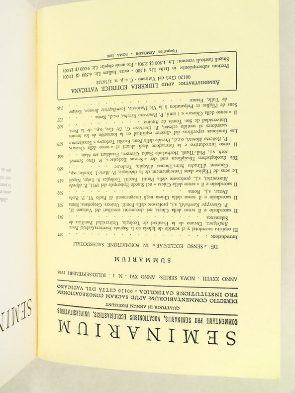 1 vol. in-8 br., Commentarii pro seminariis, vocationibus Ecclesiasticis, Universitatibus, Seminarium, 1976, pp. 527-763