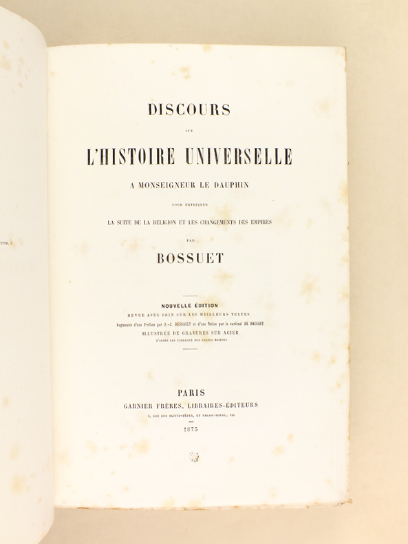 "Edition originale. En-tête, lettre initiale et cul-de-lampe final gravés en taille-douce d'après Le Pautre par Jolain. Le Discours sur l'Histoire Universelle est tout à la fois une œuvre pédagogique, qui venait conclure dix années de préceptorat auprès du Dauphin, et une œuvre théologique destinée à défendre la thèse d'une activité incessante de la Providence divine dans le déroulement de l'histoire humaine. La mention ""Cercle de Lorient"", frappée sur le premier plat, nous rappelle l'extraordinaire engouement, venu d'Angleterre, pour les cercles. Elle nous évoque aussi la ville de Lorient qui dut son nom (l'Orient) et son histoire à la venue sur son site de la Compagnie des Indes à la fin du XVIIe siècle. Bel exemplaire en maroquin du temps."