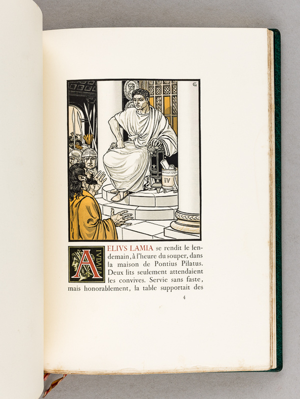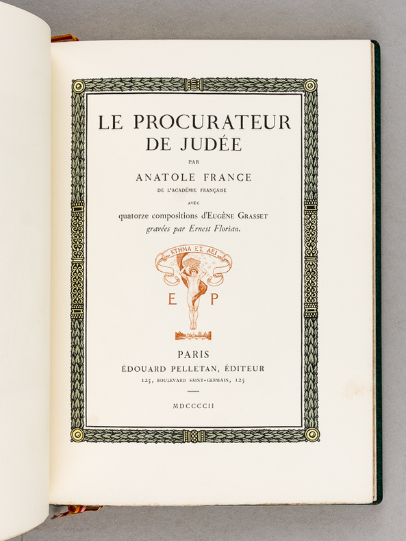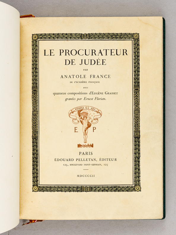 Couverture souple originale, 25 x 18,5 cm, 44 + (22) pp., français, 1ère édition, illustrations, état du livre: Comme neuf. « Le Procurateur de Judée » d'Anatole France, initialement publiée en 1892, a connu une édition de prestige très recherchée en 1902 chez l'éditeur Édouard Pelletan.rn Cette version de 1902 est illustrée par des gravures de Grasset (Eugène Grasset), artiste majeur de l'Art nouveau.rnContenu : La nouvelle met en scène Ponce Pilate à la retraite, discutant avec un ami de ses souvenirs en Judée. La chute célèbre révèle que Pilate a totalement oublié l'existence de Jésus-Christ.rn