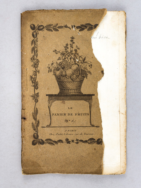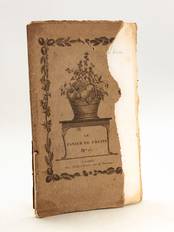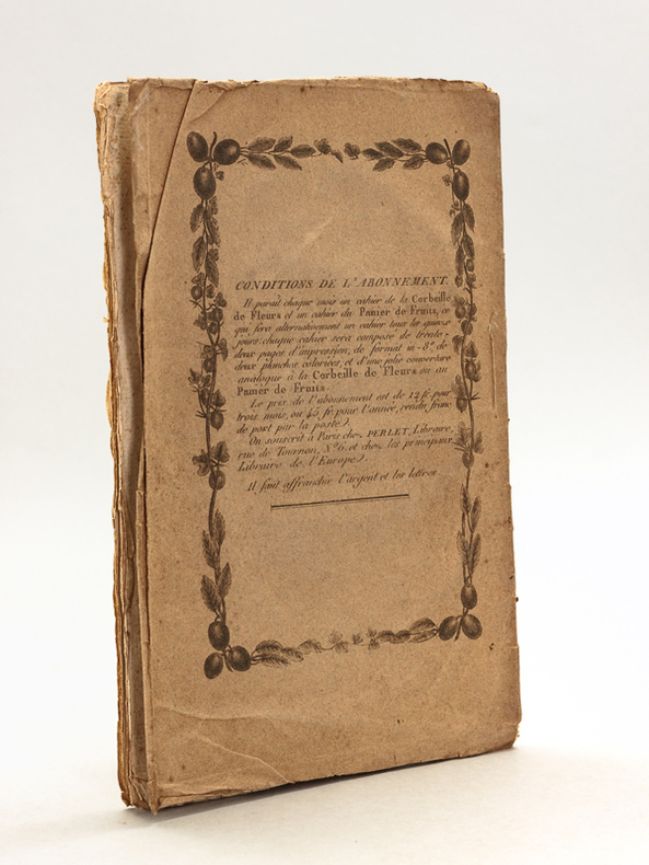 "Il paraît chaque mois un cahier de la Corbeille de Fleurs et un cahier du Panier de Fruits, ce qui fera alternativement un cahier tous les quinze jours : chaque cahier sera composé e trnte-deux pages d'impressions, de format in-8e, de deux planches coloriées et d'une jolie couverture analogue à la Corbeille de Fleurs ou au Panier de Fruits". Etat satisfaisant (fort accroc avec important manque en couv., qq. rouss. et petits frott.) pour cette première livraison d'un étonnant journal alternant littérature et sciences naturelles.