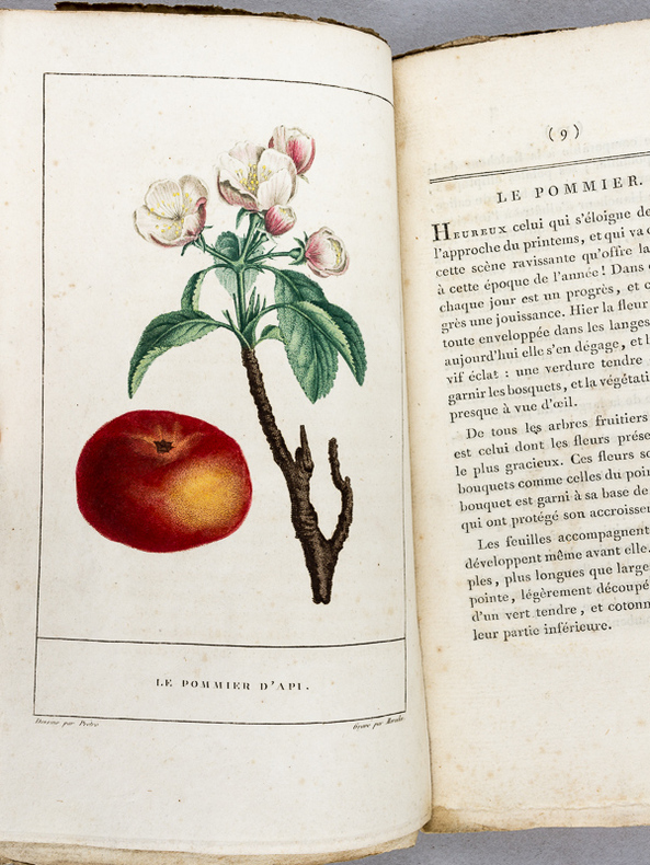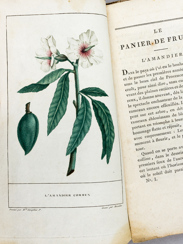 1 brochure in-8, Chez Perlet, Paris, s.d. [ 1807 ], pp. 1 - 32 avec 2 planches hors texte en couleurs, dessinées par Mlle Joséphine P. ("L'amandier commun") et M. Prêtre ("Le Pommier d'Api"), gravées par Maradan