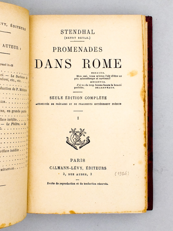 Paris, Delaunay, 1829, in-8, 2 vol. : front, [4]-IV-450-[1] pp, 1 pl. dépl.; front, [4]-592 pp, Demi-veau moderne, Édition originale. "Beyle est un guide pénétrant et sûr en Italie; ses Promenades dans Rome sont exactement la conversation d'un cicerone, homme d'esprit et de vrai goût, qui vous indique en toute occasion le beau, assez pour que vous le sentiez ensuite vous-même, si vous en êtes dignes" (Sainte-Beuve, cité d'après Paupe). Les Promenades dans Rome sont publiées à la suite de l'Histoire de la peinture en Italie, de la Vie de Rossini et des deux versions de Rome, Naples et Florence. Ici aussi, le journal de voyage sert à démontrer la beauté artistique de l'Italie, mais plus encore, à écrire sur les femmes, sur le gouvernement papal, sur les moeurs et enfin à critiquer le régime post-napoléonien. Beyle revient également sur le thème du brigandage, en rapportant la mésaventure tirée du journal de son ami et cousin Romain Colomb (T. II, p. 508 et suiv.). Exemplaire complet des frontispices, du plan des vestiges de Rome et de l'errata au tome I. Le plan de Rome est dans son premier état, avant les hachures indiquant les montagnes (Carteret). Ex-libris manuscrit sur le faux-titre du T. II. ("C.T.") et cachet humide en regard. Auréoles et rousseurs. Carteret II, 352. Cordier n° 75. Paupe 53-55. Vicaire I, 455. Couverture rigide
