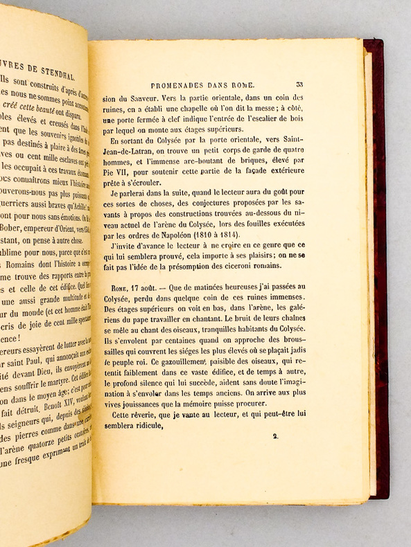 « Un des plus libres et des plus vivants exposés d’une pensée toujours originale et vive ». Paris, Delaunay, 1829. 2 volumes in-8 de : tome I : faux-titre, titre, iv p. avertissement, 450 pages et 1 f. errata, 1 gravure de Saint-Pierre de Rome, 1 plan des vestiges de Rome replié ; tome II : faux-titre, titre, 592 pages, planche de la colonne Trajane, qq. annotations et passages soulignés au crayon, texte piqué, ex libris manuscrit à l’encre sur les gardes. Demi-veau vert, dos lisses ornés de roulettes dorées et de fleurons à froid, tranches mouchetées. Reliure de l’époque. 200 x 125 mm.