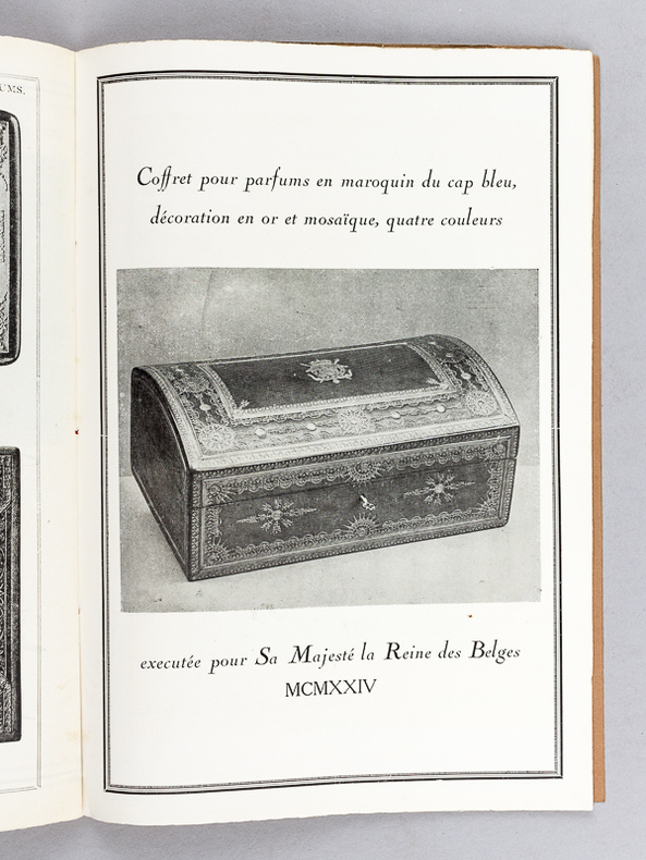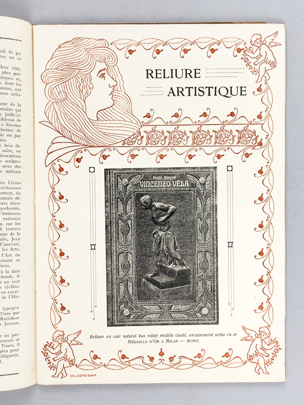Très rare catalogue français de reliures artistiques du relieur italien d'origine milanaise Augusto del Zoppo, maître incontesté en son temps pour la reproductions des plus belles reliures italiennes vénitiennes ou florentines. Très bon état (avec divers cachets de Del Zoppo en garde : Hors concours, Exposition Internationale des Arts Décoratifs Paris 1925 - Hors concours Membre du Jury Exposition Coloniale Internationale Paris 1931 - Président du Jury de Classe de Groupe et Jury Supérieur Exposition Universelle Bruxelles 1935). Il semblerait qu'en 1925, Del Zoppo ai prélevé sur son propre cou la peau nécessaire au motif central (un papillon) de sa reliure "Farfalla Umana" ("Le Papillon Humain") en maroquin rouge mosaïqué ! C'était pousser bien loin la conscience (ou l'inconscience) professionnelle ! Très bon état
