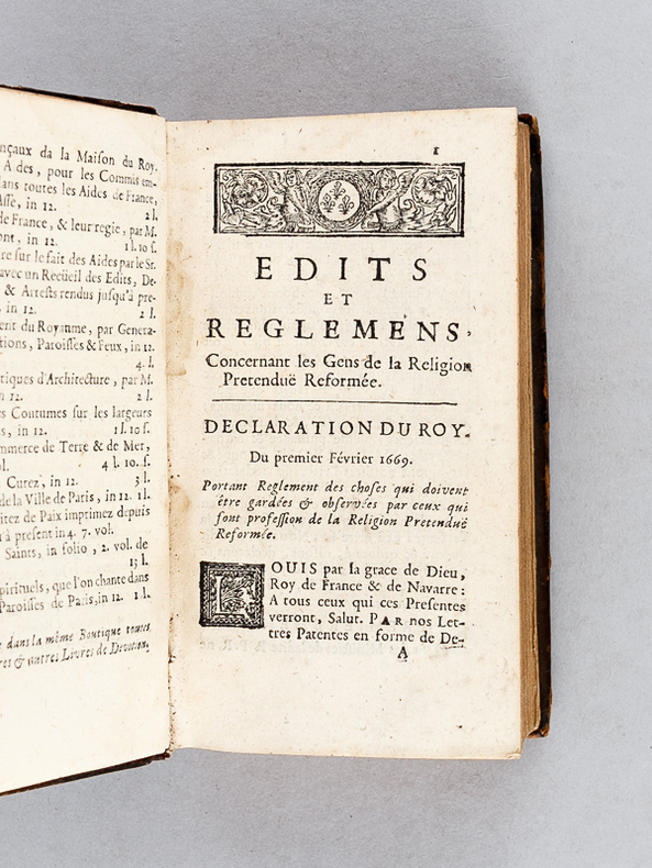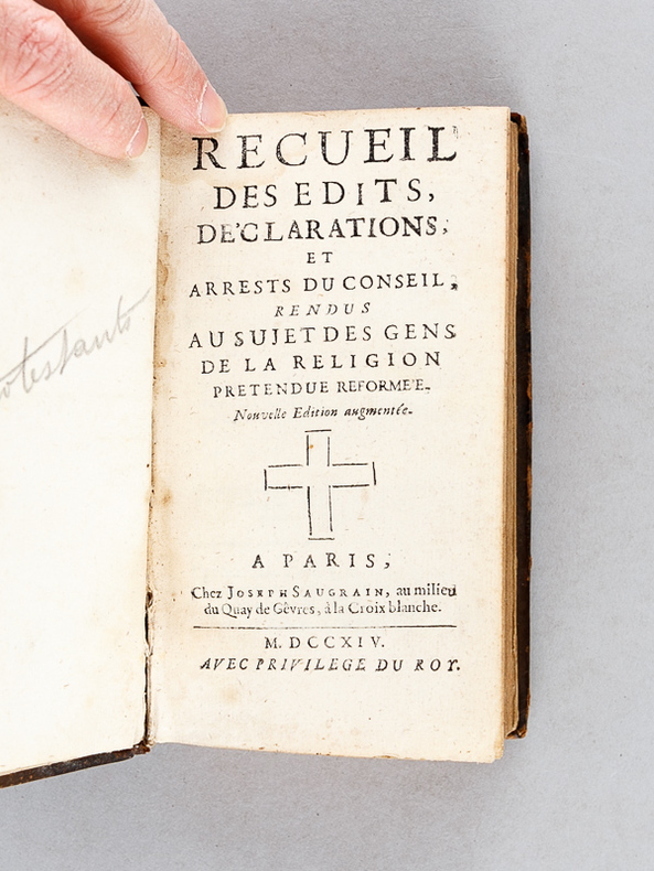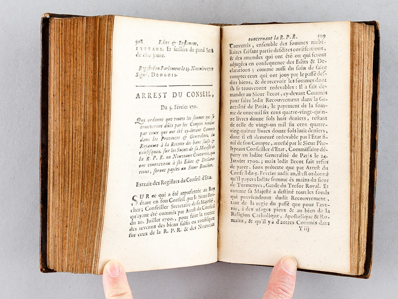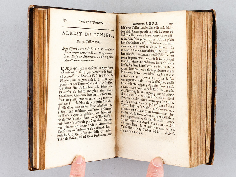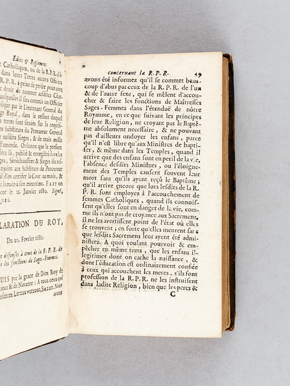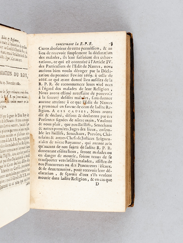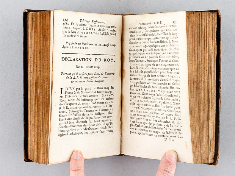 En fin d'ouvrage, on trouve en pagination séparée, une "copie de la Lettre de Monsieur de Pontchartrain à Monsieur l'Evêque de Chartres", à propos des écoles destinées à accueillir les nouveau convertis, puis une Déclaration du Roy du mois de novembre 1662 "concernant les Terres abandonnées dans la Haute & Basse Alsace, etc." Bon état (coiffe sup arasée, un cahier faible, bon exemplaire par ailleurs) pour cet exemplaire de l'édition augmentée, publiée un an avant la mort de Louis XIV