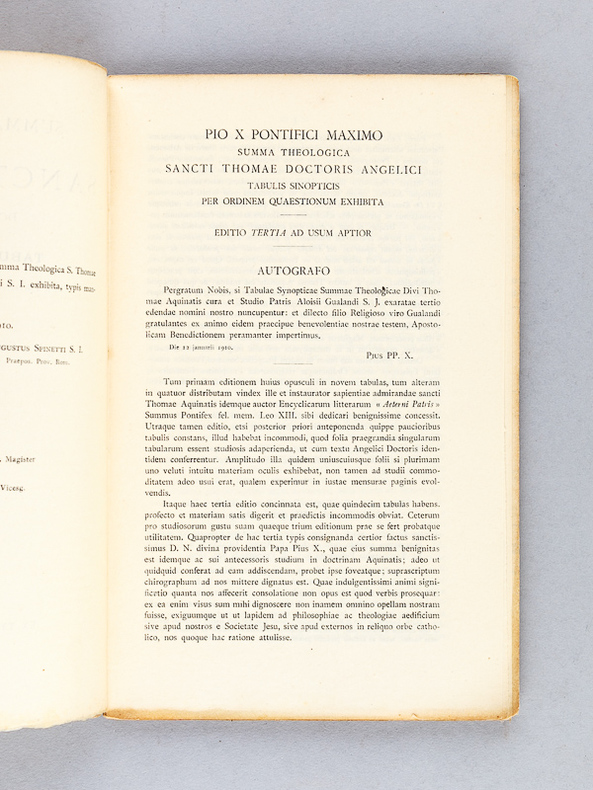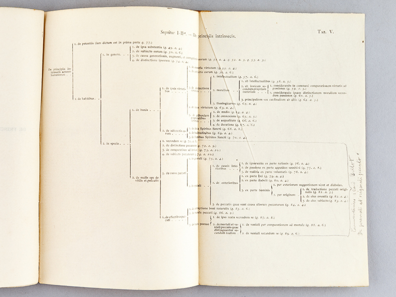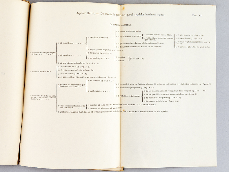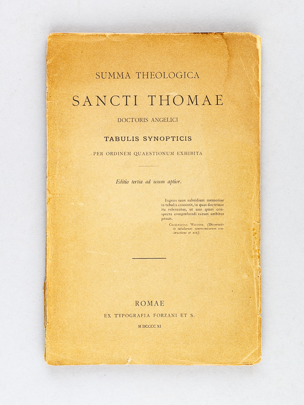 Curieux ouvrage, peu commun, proposant 15 tableaux synoptiques dépliants exposant le plan complet de la Somme Théologique. Etat satisfaisan (couv. débrochée avec petit mq. en dos)