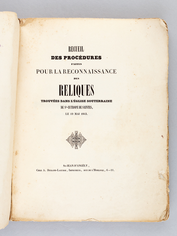 1 vol. in-4 br., Saint-Jean d'Angély, Chez A. Durand-Lacurie, Imprimeur, s.d. [ crica 1843 ], 3 ff., 116 pp. avec une planche lithographiée hors texte