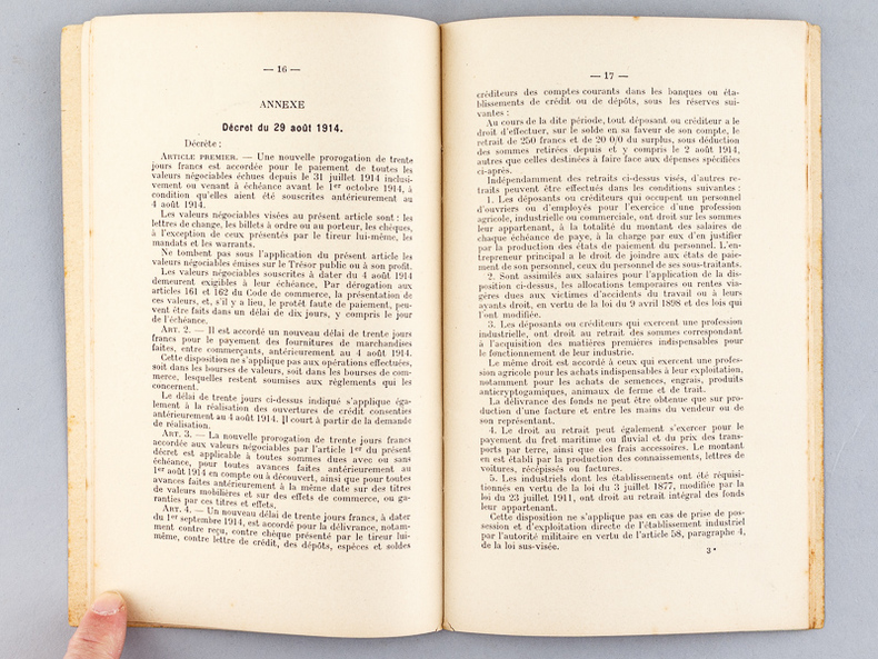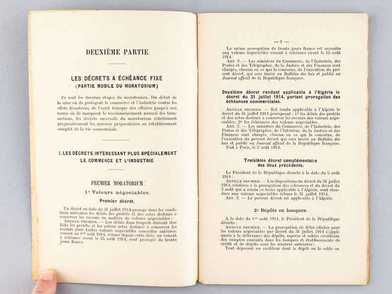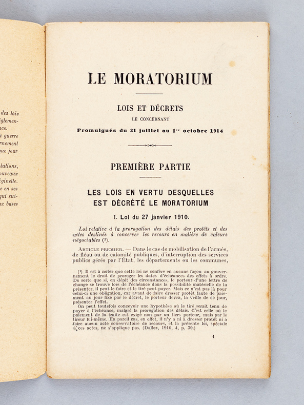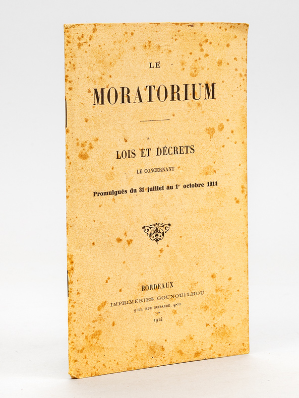 La préface précise que l'on "trouvera ici une collection assez complète des lois et décrets qui, sous le nom de Moratorium, forment la réglementation momentanée du commerce et de l'industrie en France. A une situation exceptionnelle et transitoire, comme la guerre que nous subissons, le législateur a prévu et le gouvernement applique une sorte de Code passager qui se modifie chaque jour au gré des circonstances". Bon état (rouss. sur couv.)