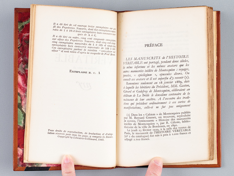 Un des 13 exemplaires sur pur fil des Papeteries de Navarre, un des 3 exemplaires hors commerce marqués de A à C (exemplaire A), 1 vol. in-12 reliure plein chagrin brun, plats mosaïqués, couvertures conservées, NRF, Gallimard, Paris, 1942, 148 pp. et 2 ff.