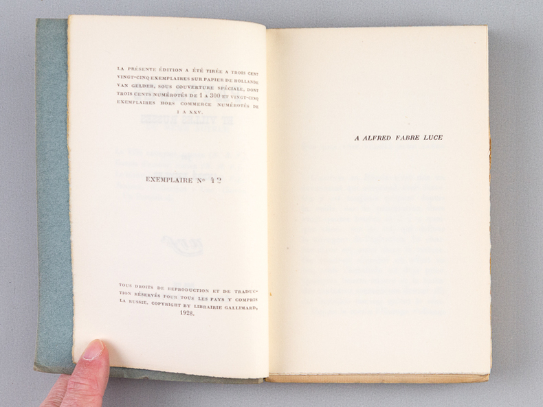 Un des 325 exemplaires numérotés sur papier de hollande Van Gelder (n° 42) sous couverture spéciale, 1 vol. in-12 br., NRF, Librairie Gallimard, Paris, 1928, 226 pp. et 1 f.