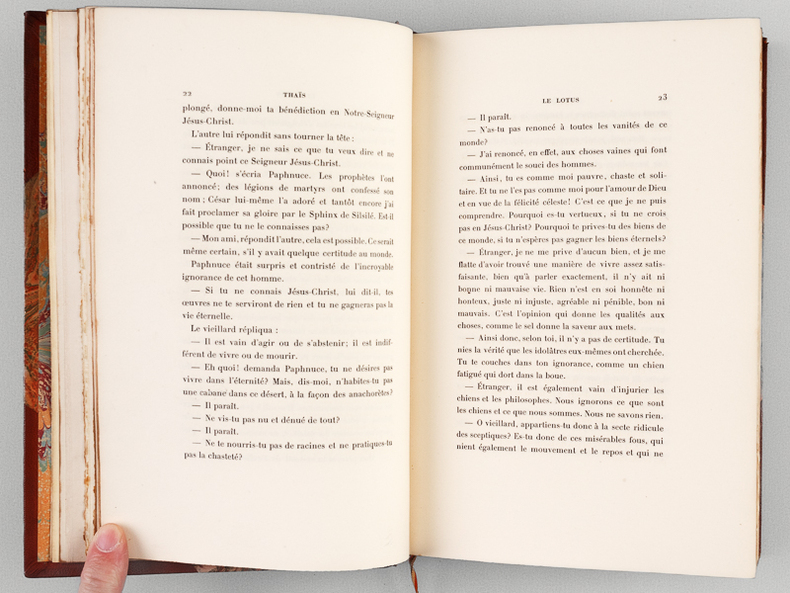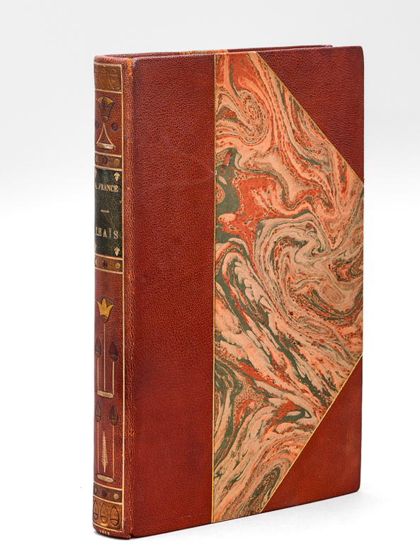 Paphnuce est un abbé d'un groupe de moines cénobites égyptiens fondamentalistes (IVe siècle après J-C). Il s'est retiré dans le désert pour se repentir de sa jeunesse frivole. Après des années de vie monacale, une vision le pousse à revenir sur les lieux de son adolescence. Illuminé, il se donne pour mission de "sauver l'âme" de Thaïs, courtisane de la ville d'Alexandrie, célèbre pour les qualités de son esprit autant que pour sa beauté éblouissante. Paphnuce va parvenir à convaincre la belle Thaïs de rejoindre la vie religieuse afin de trouver le chemin du Ciel et la vie éternelle. Cependant, Paphnuce tombe éperdument amoureux et dès lors, il est dévoré par la jalousie sexuelle en imaginant tous les hommes que Thaïs a accueillis dans son lit. Toute une vie de prières et d'ascétisme, ne réussira pas à éteindre le feu que la seule vue de Thaïs a engendré dans son coeur. Il finira par renier Dieu en recueillant le dernier souffle de Thaïs. volume in-8 180x120, joliment relié, en excellent état, Paris Calman Levy 1928/1930 ref/263