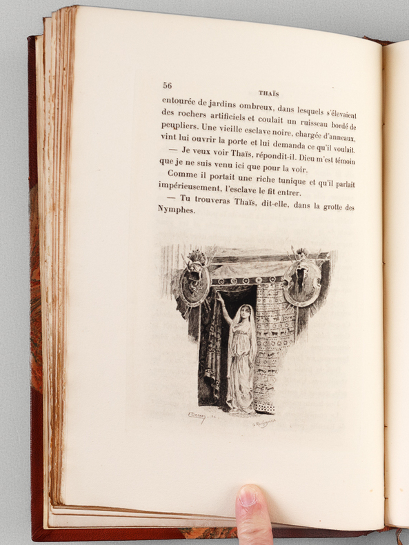 Ce roman fut publié dans la Revue des Deux Mondes en 1899, puis édité chez Calmann-Lévy en 1890. Il conte la vie de Thaïs, une belle courtisane du IVème siècle officiant à Alexandrie et dont la renommée était importante. Le moine Paphnuce parvint à la convertir au Christianisme, mais la beauté de la pécheresse hanta son coeur. Le réalisme, souvent cruel, du trait de Raphaël FREIDA, est ici magnifié. Ce roman inspira Jules Massenet dont il tira son célèbre opéra "La Méditation de Thaïs". Les gravures ont été tirées à la presse à bras par Leblanc et Trautman. Tirage limité à 781 exemplaires. Un des 700 exemplaires sur Vélin de Rives. Usures et petites déchirures à l'étui, infimes usures à la couverture. "Edition recherchée" (Carteret IV, 171 ; Monod 4960).