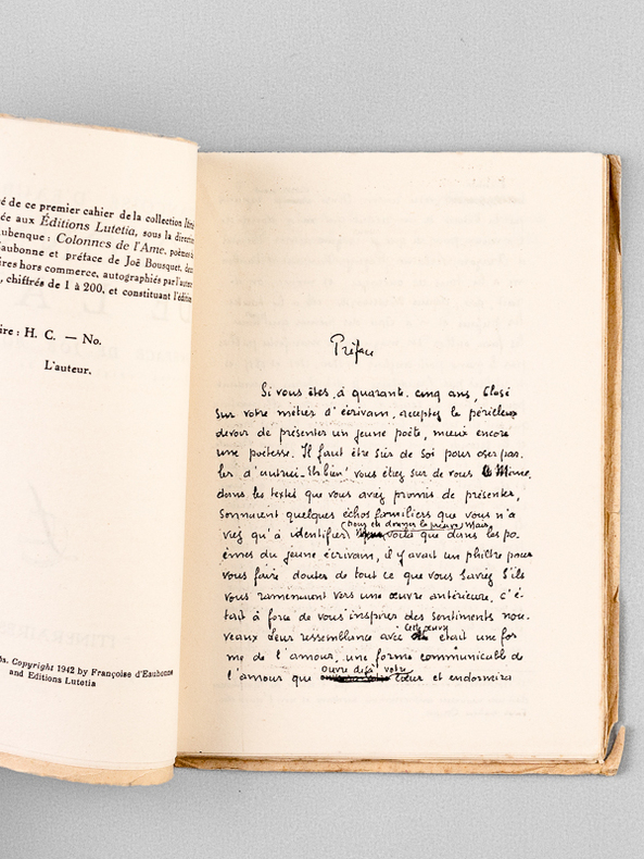 Exemplaire hors commerce marqué H.C. non numéroté (la justification signale 200 exemplaires hors commerce numérotés), Préface de Joë Bousquet, ouvrage illustré de dessins de l'auteur, 1 vol. in-12 br., coll. "Itinéraires", n°1, Cahiers publiés sous la direction de Jacques Aubenque, Editions Lutétia, Paris, 1942