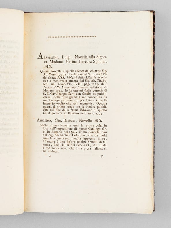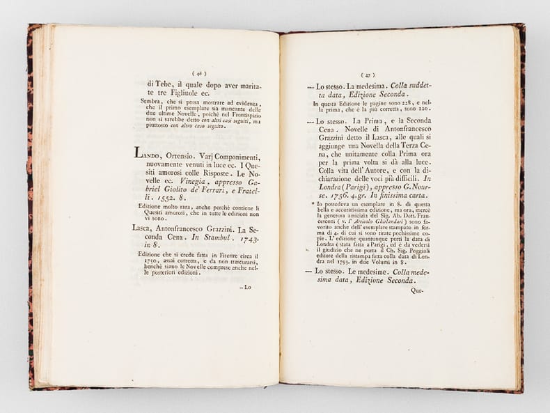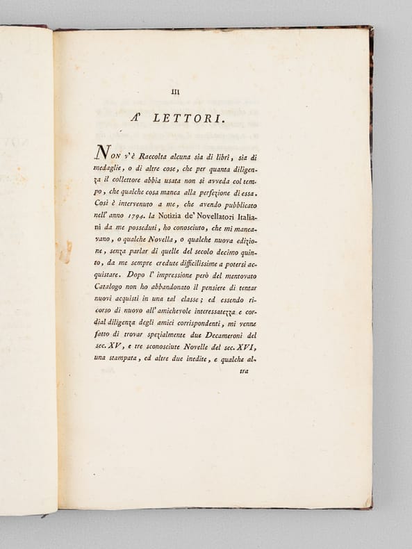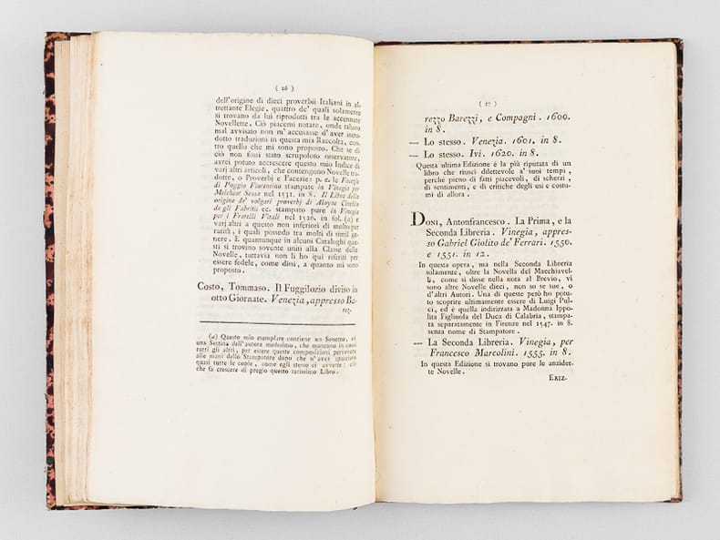Edizione seconda, con Aggiunte, ed una Novella inedita, 1 vol. in-8 reliure demi-cuir de russie rouge, Dalla Tipografia Remondiniana, Bassano, 1805, XIX-132 pp.