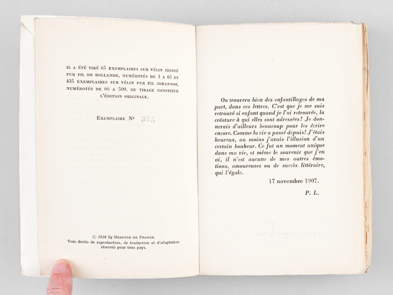 Un des 435 exemplaires sur vélin pur fil Johannot, numérotés de 66 à 500 (n° 398), 1 vol. in-12 sous couv. rempliée, Mercure de France, Paris, 1956, 255 pp.