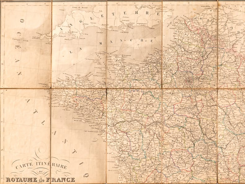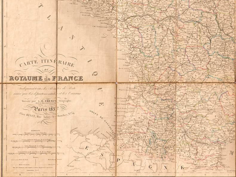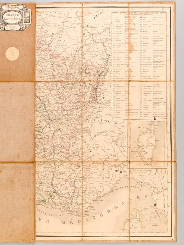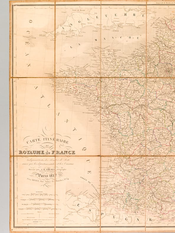 Dressée par A.R. Frémin, Chez Binet, Paris, 1837, 1 carte dépliante entoilée format 76,3 x 59,5 cm, limites des départements rehaussées en couleurs