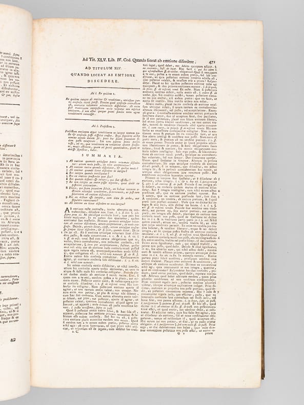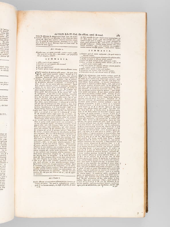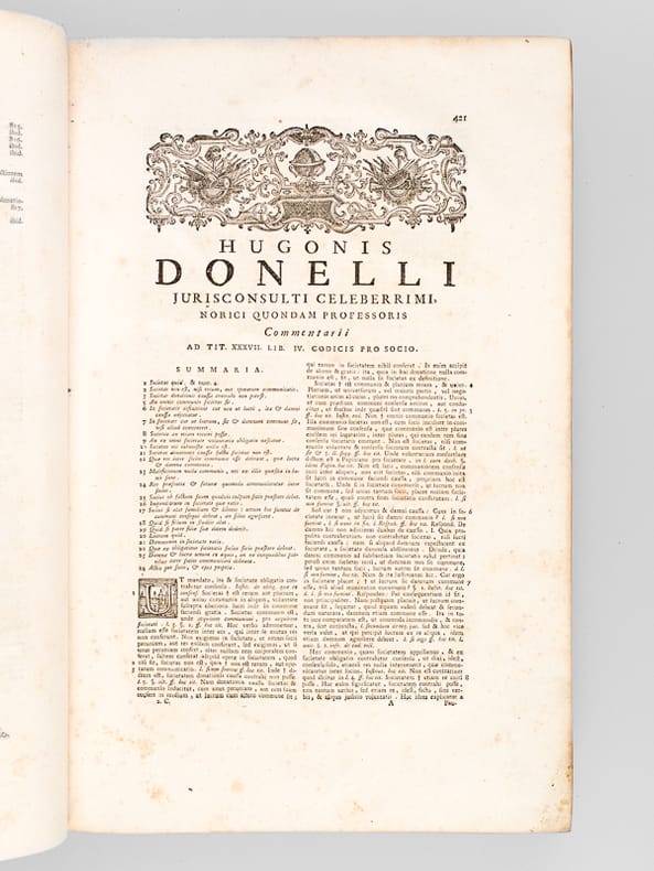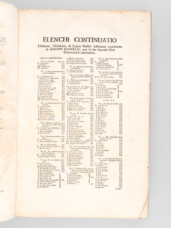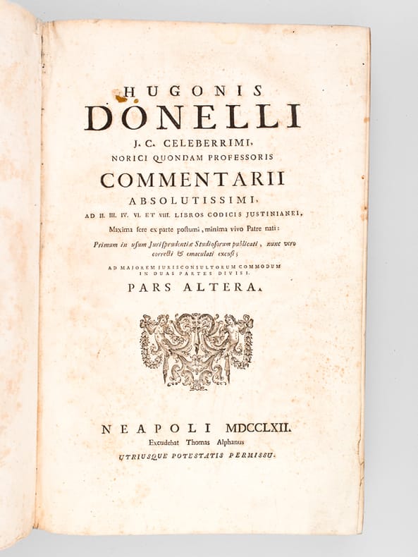 Tome second seul ("Pars Altera") de cette édition napolitaine des Commentaires de Doneau sur les livres 2, 3, 4, 6 et 8 du Code Justinien. Né en 1527 à Châlons-sur-Saône, mort en 1591, le jurisconsulte calviniste Hugues Doneau fut à la suite d'Alciat un représentant éminent de l'humanisme juridique, insistant particulièrement sur l'établissement d'un système juridique cohérent. Professeur à Toulouse, il y croisera Jacques Cujas. Les indications en italien du privilège indique que cet ouvrage s'insère dans un projet de réédition des "Commentari delle Leggi di Ugone Donelli" en douze volumes in-folio (on sait qu'une telle édition sera publiée à partir de 1762, à Lucques). Bon état (reliure un peu frottée avec qq. mouill., petit accroc avec mq. en page de titre, qq. traces d'usage mais bon exemplaire par ailleurs).