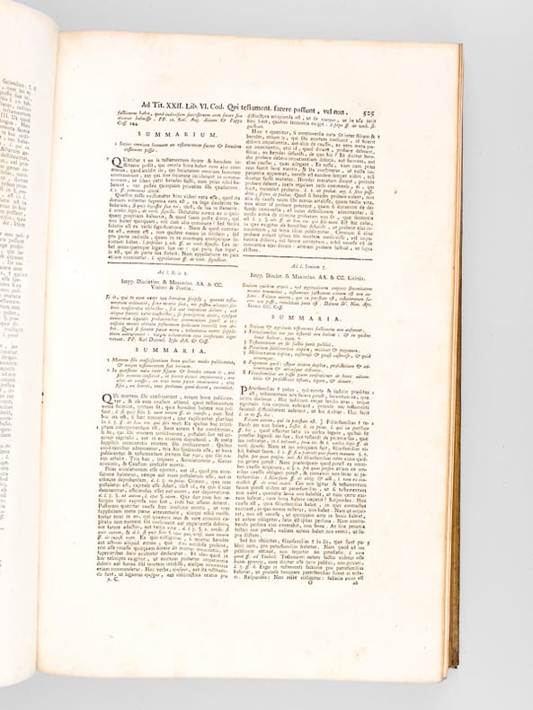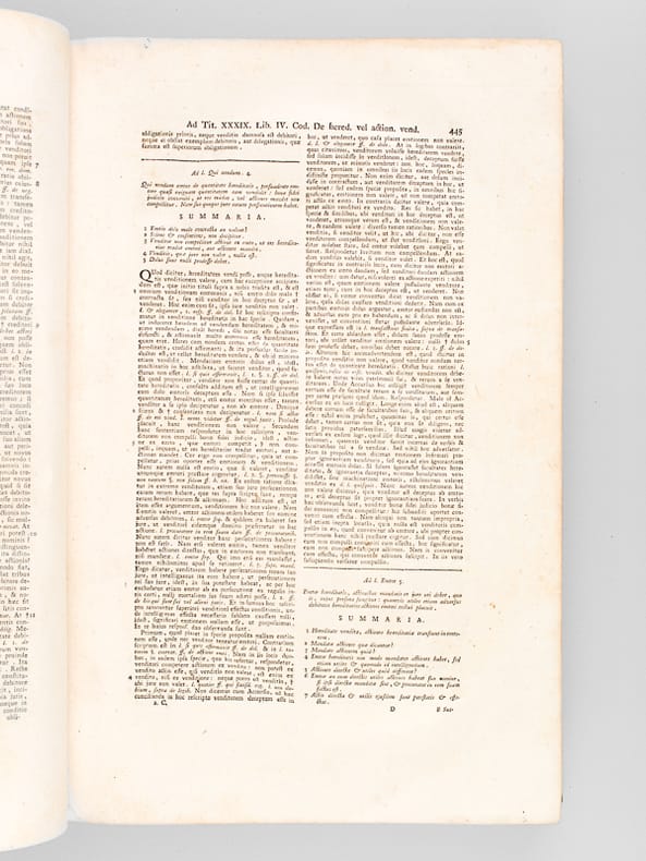 Primum in usum Jurisprudentiae Studiosorum publicati, nunc vero correcti & emaculati excusi ; ad majorem jurisconsultorum commodum in duas partes divisi. Pars Altera, 1 vol. in-folio reliure plein vélin blanc, Excudebat Thomas Alphanus [ Tommaso Alfano ], Neapoli [ Naples ], 1762, 4 ff., pp. 421-872