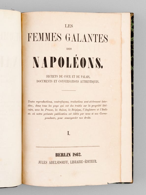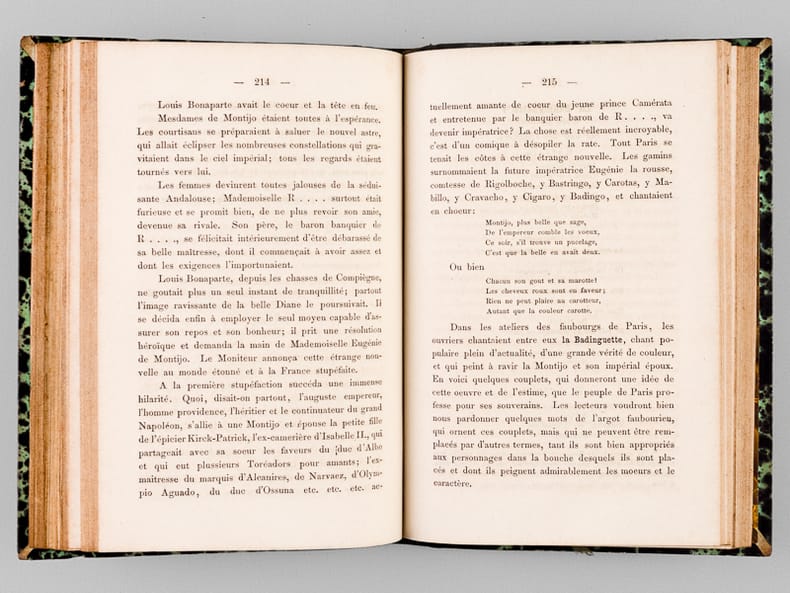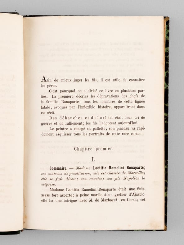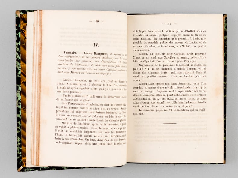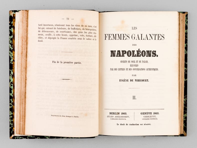Rare exemplaire complet de ce rude pamphlet antibonapartiste. Personnage considérable de la vie littéraire, Eugène de Mirecourt est resté célèbre pour sa série des "Contemporains". Il eut une fin de vie étonnante : entré à 60 ans chez les dominicains de Poërmel, il est fait prêtre et est envoyé à Port-au-Prince, en Haïti, où il meurt le 13 février 1880. Bon état (nerfs lég. frottés, bon exemplaire par ailleurs).