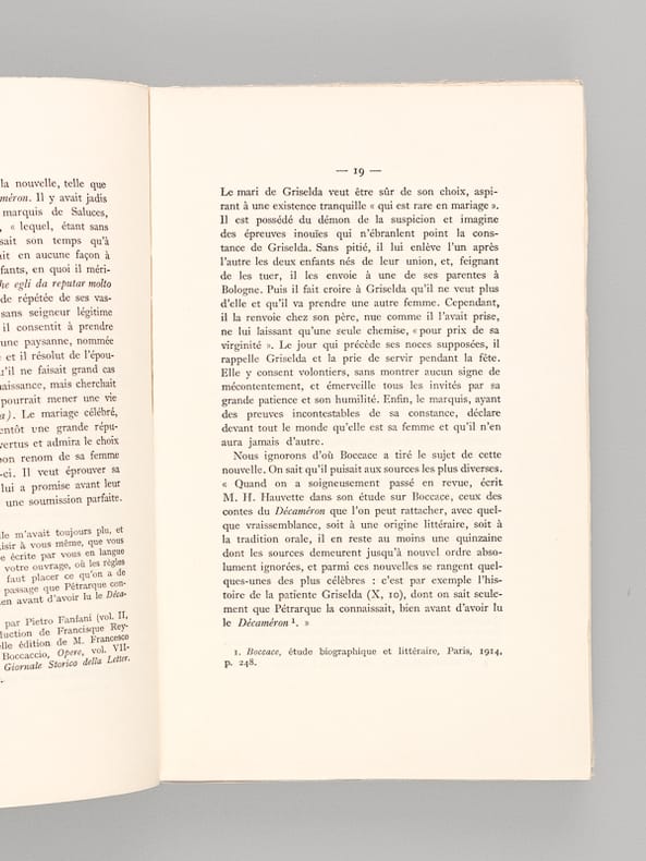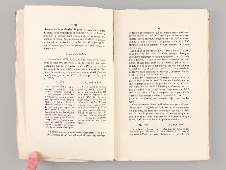 Bon état. L'auteur s'intéresse aux deux traductions en prose française de la version latine par Pétrarque de l'histoire de Griselda (dernière nouvelle du Décaméron de Boccace).