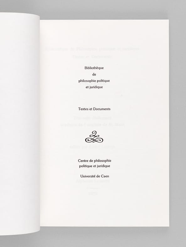 Traduit de l'anglais de M. Huet, édités par André Lefèvre, 1 vol. petit in-8 br., Bibliothèque de Philosophie Juridique et Politique, Textes et documents, Centre de Philosophie Juridique et Politique, Caen, 1985, 104 pp.