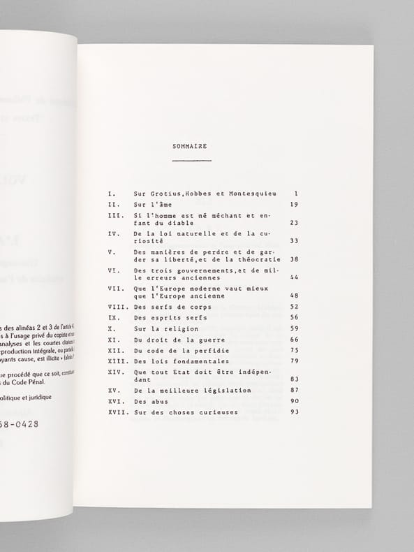 Très intéressant reprint de l'édition Lemerre de 1879, dans lequel on voit Voltaire s'atteler à la critique de Grotius, Montesquieu et Hobbes : "En un mot, Grotius est un franc pédant, Hobbes un triste philosophe et Montesquieu un bel esprit humain"...