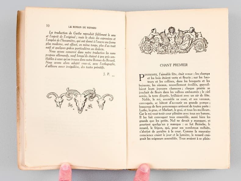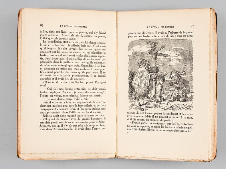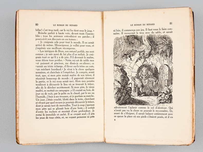 Composée entre 1170 et 1250, le Roman de Renard n'est pas l'oeuvre d'un seul auteur, mais une compilation d'histoires mêlant folklore populaire et création savante de clercs férus de culture latine (Pierre de Saint-Cloud, Richard de Lison). Le Roman de Renard met en scène une féodalité parodique d'animaux (Renard, Ysengrin le loup, Chantecler le coq, Brun l'ours, le corbeau Tiercelin, Noble le lion, Couart le lièvre, etc.) A la fois satire sociale et comédie de moeurs, on y trouve aussi l'inspiration des fables ésopiques gréco-latines. La légèreté drôle des scènes fut la raison de son succès, et de sa postérité. Bel exemplaire. Libraire membre du S.L.A.M. (Syndicat national de la Librairie Ancienne et Moderne) et de la L.I.L.A. (Ligue Internationale de la Librairie Ancienne). N'hésitez pas à prendre contact par mail pour des photographies et des détails supplémentaires, pour des recherches ou des estimations de livres anciens et rares.