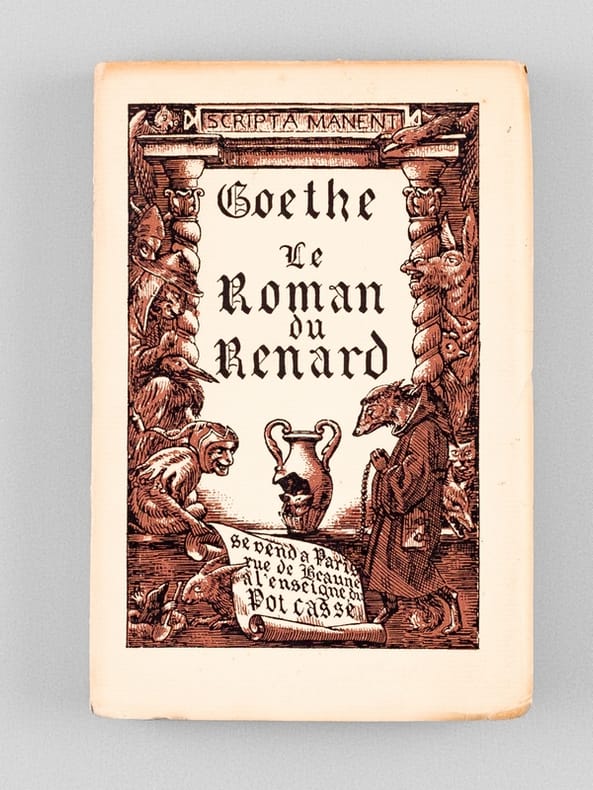 Bon état (très petits accrocs en bord de couv., qq. rouss., bon exemplaire par ailleurs). Goethe s'est inspiré de la version allemande du Roman de Renart composé sans doute vers 1180 par l'alsacien Heinrich der Glichesaere et popularisée sous le titre de "Reinhart Fuchs" (ou "Reineke Fuchs").