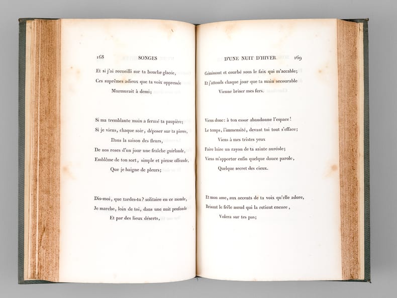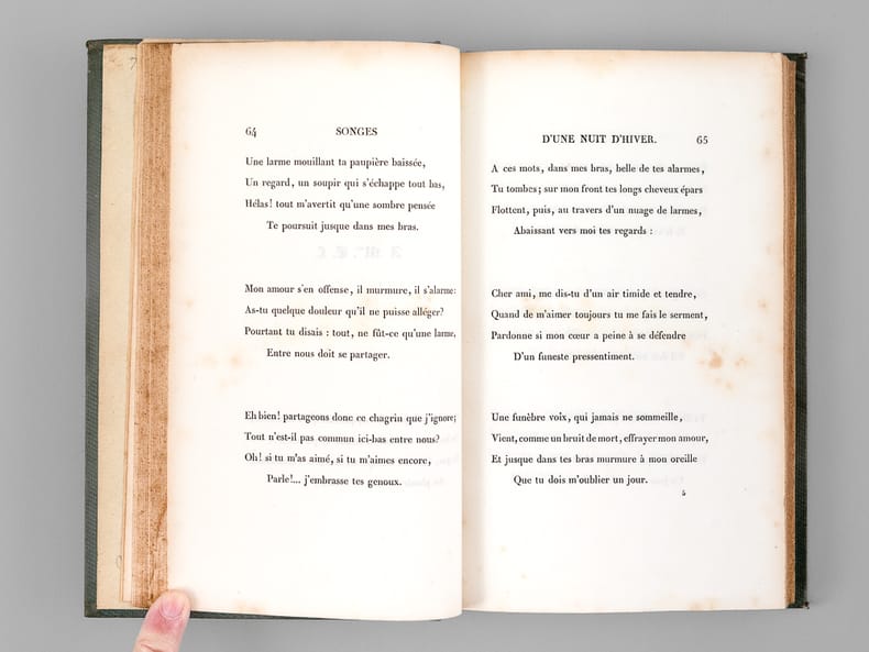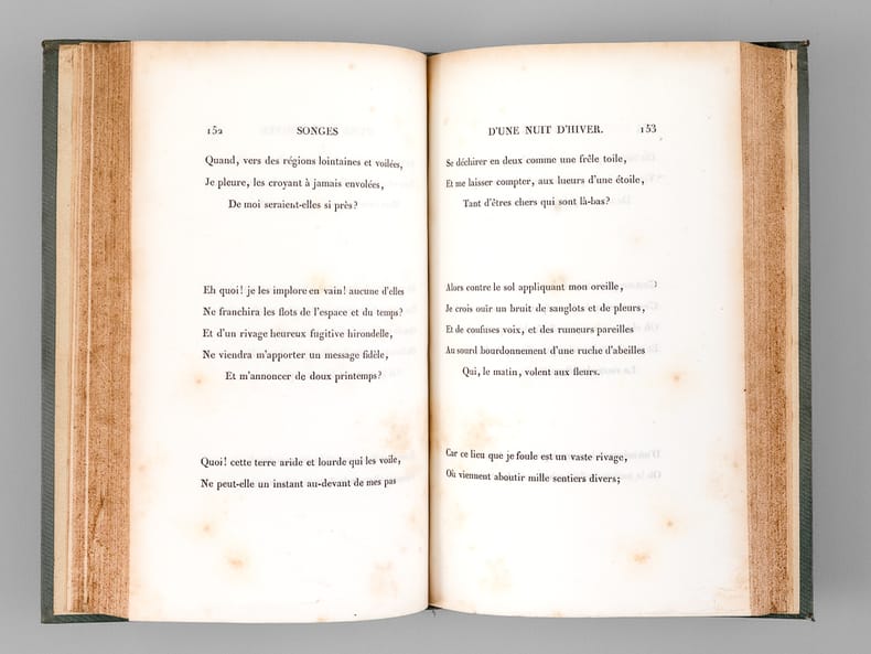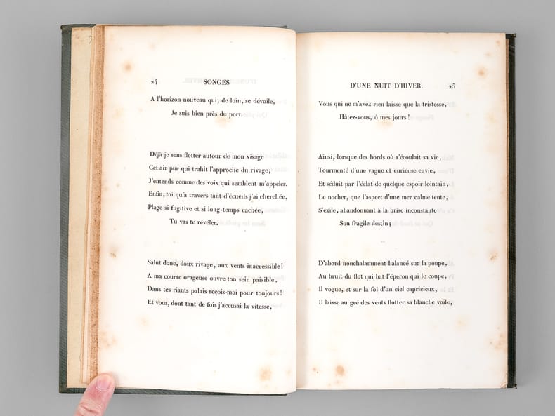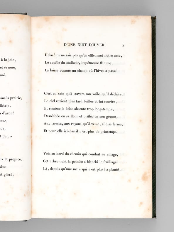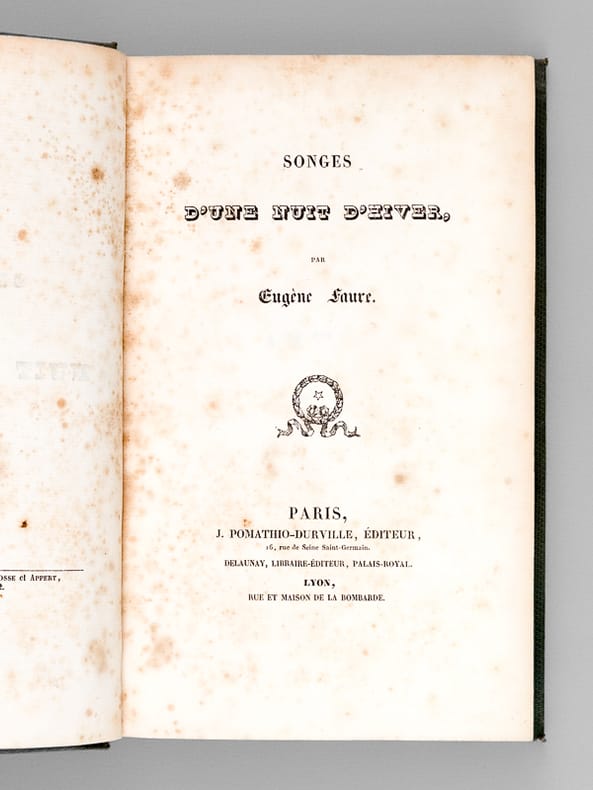 Né en Isère à Décines-Charpieu le 29 décembre 1803, François-Rémy-Eugène Faure était fils de notaire. Brillant élève, il fu touché successivement par les revers de fortune de son père, et plus fortement encore par la maladie lors de l'épidémie de choléra de 1832. Il s'éveilla alors à la chose poétique et publia en 1835 le présent recueil "bien accueilli par Chateaubriand, Victor Hugo, Charles Nodier" nous dit son ami Pétrequin. Bon état (dos un peu frotté, qq. rouss.) pour ce recueil imprimé sur beau papier vergé.
