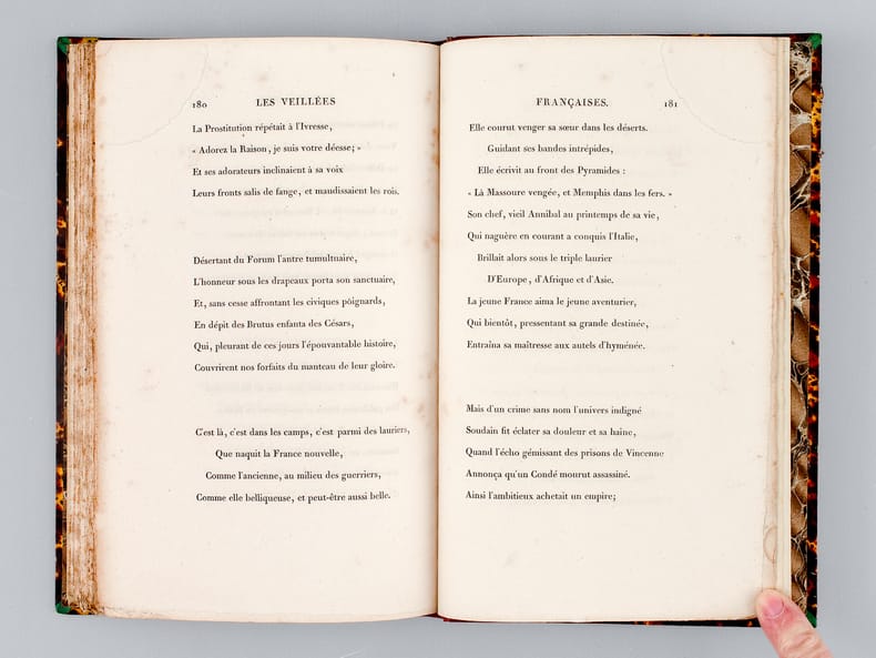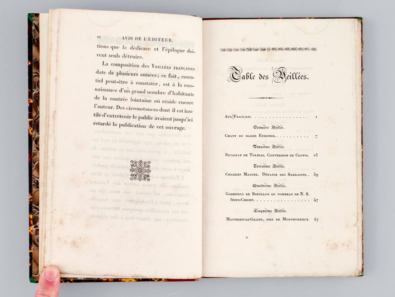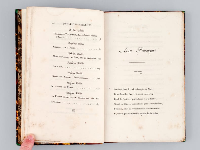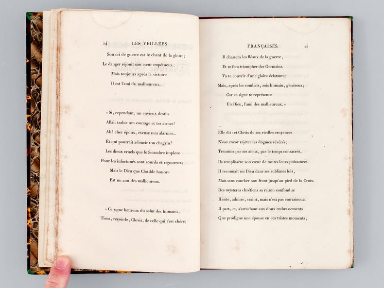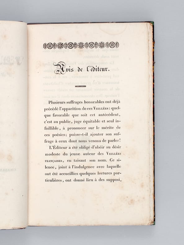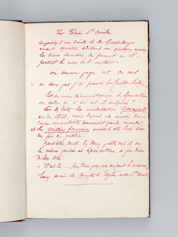Rare exemplaire de l'édition origines des "Veillées françaises" du poète créole de la Guadeloupe, Porié Saint-Aurèle (1785-1855). Une longue et intéressante note manuscrite anonyme (à l'encre rouge, en seconde garde blanche) évoque les ressemblances de certains vers de Poirié Saint-Aurèle avec ceux de Lamartine : "Par les dates, la méditation "Bonaparte" est de 1823, mais depuis des années des copies manuscrites couraient par le monde et les "Veillées Françaises" avaient été lues bien des fois en public. Peut-être aussi les deux poëtes ont ils eu la même pensée [... ]". Bon état (petite mouill. marginale intérieure en tête, ancienne trace d'ex-libris en garde, qq. rouss., bon exemplaire par ailleurs) pour cette rare édition originale du poète romantique de la Guadeloupe Jean Pierre Aurèle Poirié dit Poirié Saint-Aurèle.