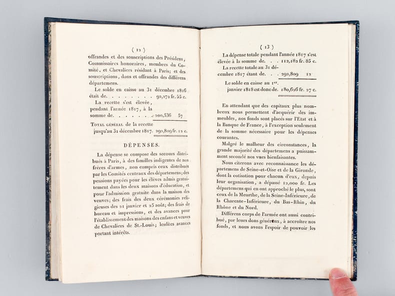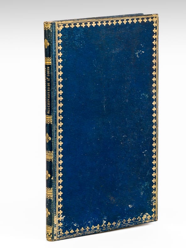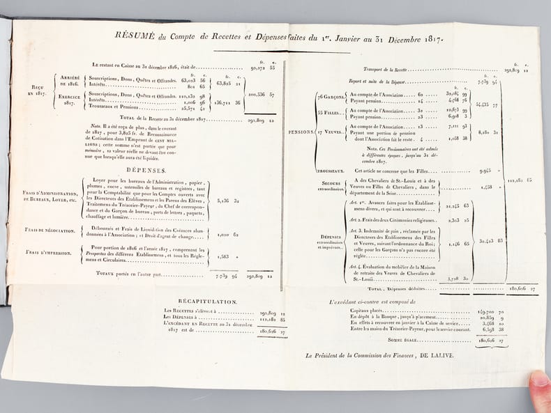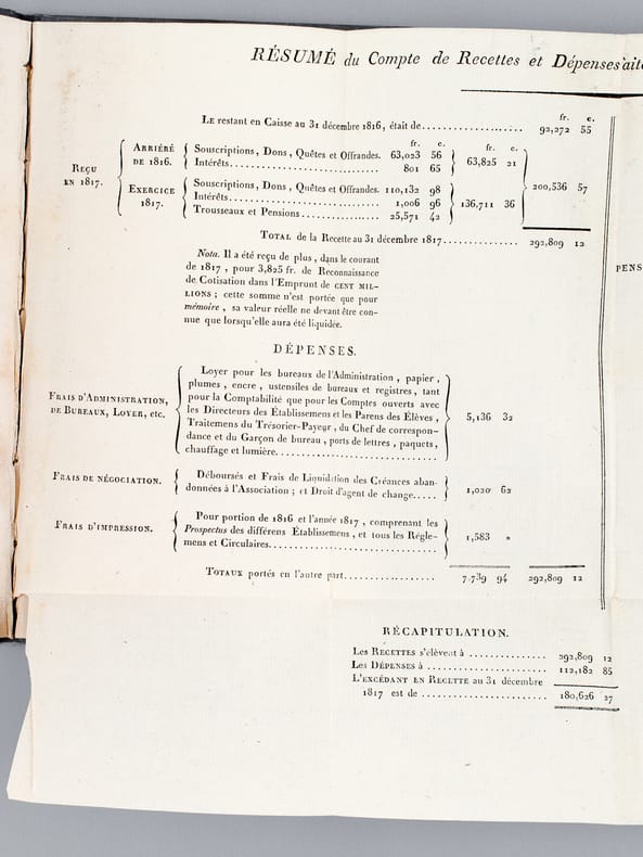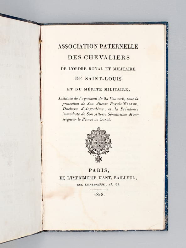 Instituée de l'agrément de Sa Majesté, sous la protection spéciale de Son Altesse Royale MADAME, Duchesse d'Angoulême, et la Présidence immédiate de Son Altesse Sérénissime Monsiegneur le Prince de Condé, 1 vol. in-8 cartonnage bleu gaufré de l'époque, dos lisse orné (fleur de lys), dentelle dorée d'encadrement fleurdelysée en plats, De l'Imprimerie d'Ant. Bailleul, 1818, 15 pp. et grand tableau dépliant