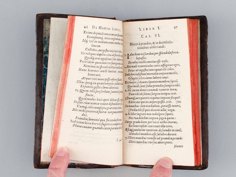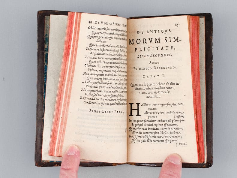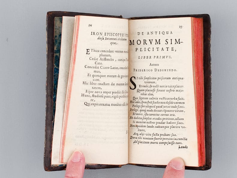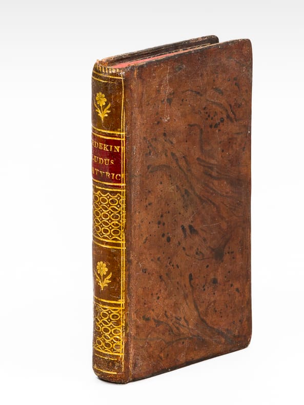 L'humaniste et théologien Friedrich Dedekind (1524-1598) fit ses études à Marburg et Wittenberg, où ses talents furent reconnus par Melanchthon. Son oeuvre la plus célèbre reste ce "Grobianus", poème élégiaque en vers latin, décrivant un fictif "Saint Grobien" enseignant de manière ironique aux hommes comment éviter les mauvaises manières, la gloutonnerie et l'ivrognerie. Grobianus, ou Grobian dans sa forme germanique, est un personnage du folklore allemand symbolisant la rustrerie et la grossièreté. Les gens n'ayant jamais été aussi mal élevés que depuis qu'on leur apprend les bonnes manières dans des traités de civilité, Dedekind propose de leurs inculquer les mauvaises manières ; alors, peut-être, leurs mœurs s'amélioreront-elles ? Bon exemplaire. The humanist and theologian Friedrich Dedekind (1524-1598) studied in Marburg and Wittenberg, where his talents were recognized by Melanchthon. His most famous work remains this "Grobianus", an elegiac poem in Latin verse, describing a fictitious "Saint Grobien" ironically teaching men how to avoid bad manners, gluttony and drunkenness. Grobianus, or Grobian in its Germanic form, is a character in German folklore symbolizing boorishness and rudeness. People having never been so badly brought up as since they were taught good manners in treatises on civility, Dedekind proposes to inculcate bad manners in them; then, perhaps, their morals will improve? Good copy.