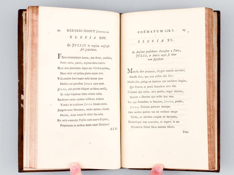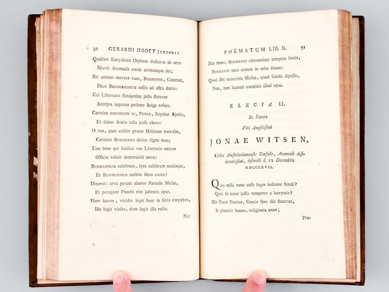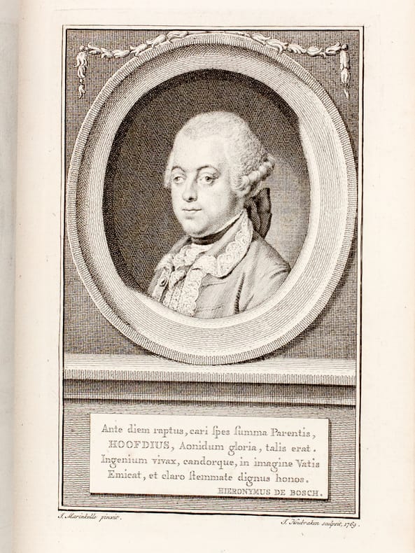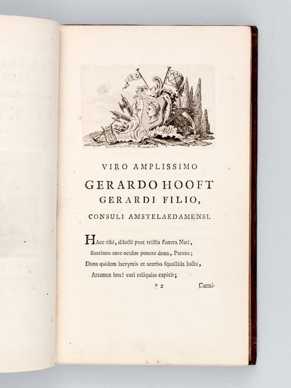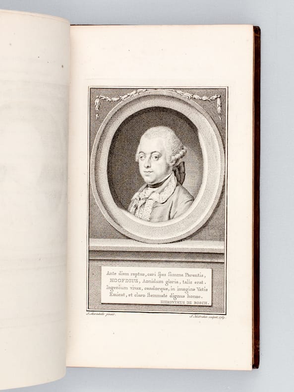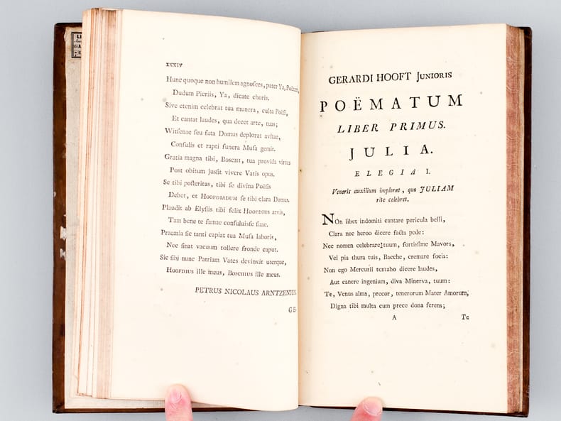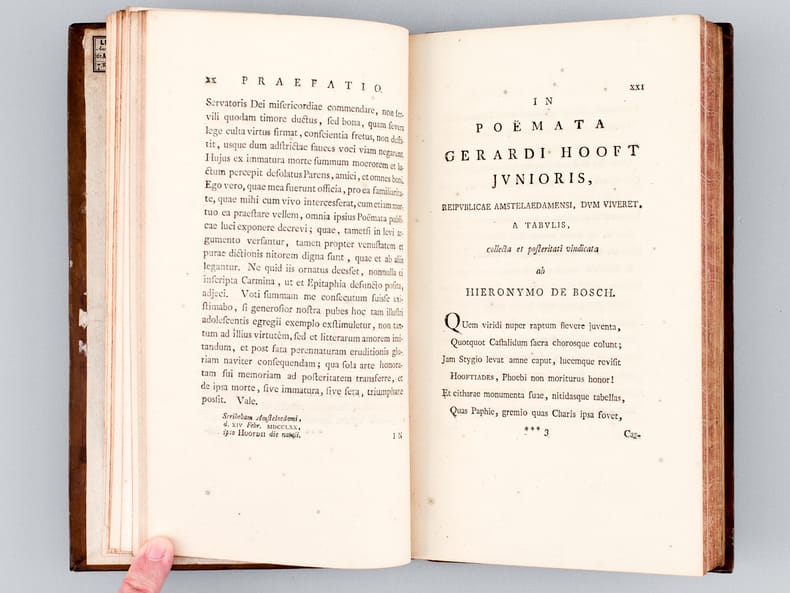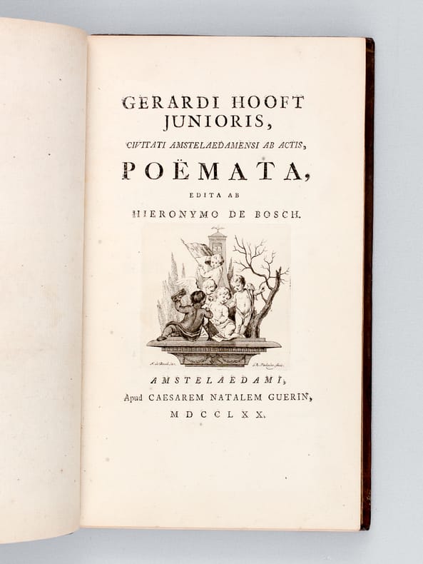 Recueil de poèmes de ou en l'honneur du poète hollandais Gerard Hooft Junior (1750-1768), mort prématurément. La préface par Jérôme de Bosch fournit des détails biographiques. Le volume comprend à la fin de l'ouvrage des poèmes en l'honneur de Hooft Junior, par Petrus Burmannus secundus, Ev. Wassenbergh, Janus Helvetius, Janus Grotius, Petrus Nicolaus Arntzenius. Bon état (reliure un peu frottée). Collection of poems by or in honor of the Dutch poet Gerard Hooft Junior (1750-1768), who died prematurely. Hieronymus Bosch's preface provides biographical details. The volume includes at the end of the work poems in honor of Hooft Junior, by Petrus Burmannus secundus, Ev. Wassenbergh, Janus Helvetius, Janus Grotius, Petrus Nicolaus Arntzenius. Good condition (binding a little rubbed)