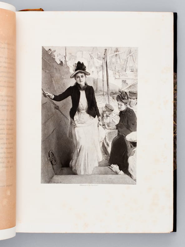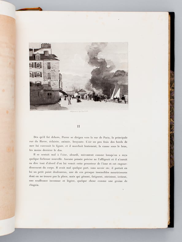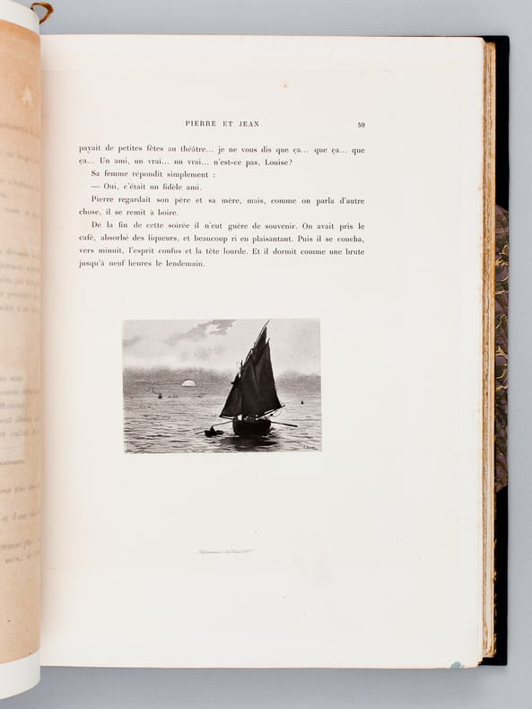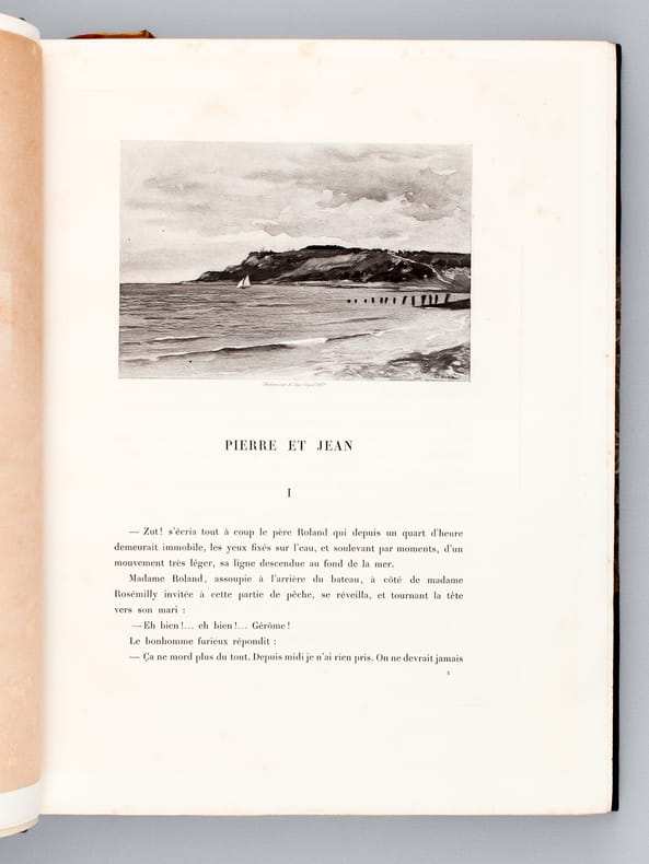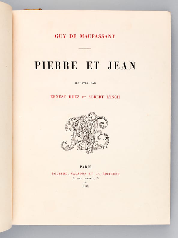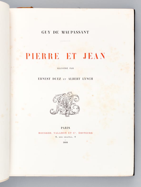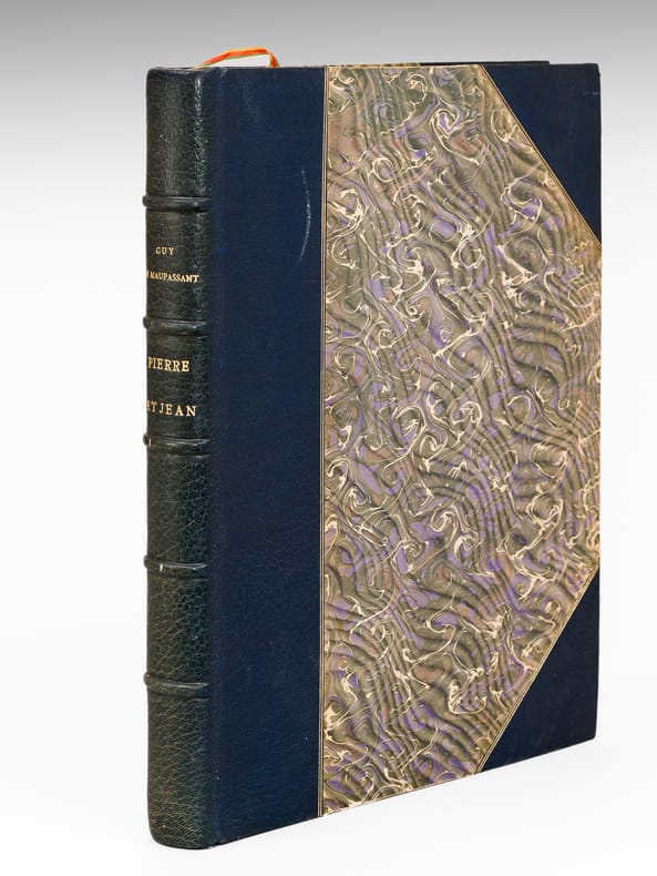 Illustré par Ernest Duez et Albert Lynch. Paris, Boussod, Valadon et Cie, 1888 1 volume grand in-4 (33 x 27 cm) de 170-(1) pages. 18 hors-texte par Albert Lynch et 18 en-tête et culs-de-lampe par Ernest Duez. Reliure demi-maroquin chocolat à larges coins, dos à nerfs janséniste. Auteur, titre et millésime dorés au dos, tête dorée. Couvertures conservées en parfait état (les deux plats et le dos). Reliure strictement de l'époque signée Victor CHAMPS. Quelques légers frottements sur les coins et coupes. Reliure fraîche. Intérieur très frais. Quelques rousseurs presque uniquement au verso des tirages sur satin contrecollés sur vélin fort. Première édition illustrée. Edition de grand luxe tirée à 50 exemplaires sur Japon avec 3 suites de toutes les illustrations (sur satin en bleu, sur Japon en bistre et sur Whatman en mauve) avec remarques. Les illustrations définitives tirées sur Japon dans le texte (E. Duez) et hors-texte (A. Lynch) sont toutes avec remarques. Avec une grande aquarelle originale signée E. Duez sur le faux-titre (fleurs de pavot). "Écrit en quelques mois à partir de l’été 1887, Pierre et Jean est le quatrième roman de Maupassant. Il constitue un tournant dans la production romanesque de l’auteur qui verse dans l’analyse psychologique. Prépublié dans La Nouvelle Revue à partir de décembre 1887, il paraît en volume chez Ollendorff, précédé d’une étude sur « Le Roman » (qui ne se trouve pas dans cette édition de luxe). [...] L’intrigue du récit peut paraître banale et est sans doute tirée d’un fait divers : petits boutiquiers parisiens, les Roland se sont retirés au Havre pour profiter de la mer. Leurs fils Pierre, étudiant en médecine, et Jean, futur avocat, viennent les retrouver. L’annonce du décès de Maréchal, un ami de la famille qui lègue tout son héritage à Jean, va être à l’origine d’un drame familial. Pierre comprend que sa mère a été infidèle et que Jean est le fils de Maréchal. L’aîné étant peu à peu dépossédé de l’amour maternel, de celui de Mme Rosémilly, jeune veuve que Jean épousera, puis de tous les avantages que son statut de fils légitime pourrait laisser supposer, il décide de quitter sa famille pour s’engager sur un paquebot transatlantique. [...] Succès littéraire, les critiques étant unanimes dans l’éloge, Pierre et Jean repose certes sur une intrigue ténue et des thèmes déjà abordés dans les contes et nouvelles, comme la bâtardise, la trahison de la femme, ou les conséquences désastreuses d’un legs dans une famille. Mais le roman vaut pour l’analyse psychologique des personnages et les magnifiques descriptions du Havre et de ses alentours, reflets de l’état d’âme du héros, rendues avec une écriture picturale. Il livre également une étude de mœurs sur la petite bourgeoisie de province. « Roman-drame » selon Jules Lemaitre, ayant le « schéma d’une tragédie antique » pour Paul Bourget, Pierre et Jean est aussi un « roman de mœurs » (Antonia Fonyi) tout autant qu’un roman familial, où la vision pessimiste de Maupassant se fait plus sombre que dans ses précédents livres. Comme la plupart des œuvres de Maupassant, Pierre et Jean connut aussitôt de nombreuses traductions et une fortune artistique importante, avec de multiples adaptations sous différents supports." (À propos de l’œuvre, Noëlle Benhamou, Les Essentiels de la littérature, Bibliothèque nationale de France, 2015). "La fratrie et la bâtardise occupent une place de choix dans les écrits de Maupassant. « Petit roman » ou « longue nouvelle » de neuf chapitres seulement, Pierre et Jean publié en 1888 aborde donc un sujet rebattu, constituant une structure obsessionnelle de l’œuvre maupassantienne. Le lecteur suit les pensées de Pierre Roland, le fils légitime, aux prises avec une enquête de filiation qui l’exclura de sa famille. Roman psychologique, mais aussi roman de la mer, Pierre et Jean peut se lire comme une réécriture de la parabole du fils prodigue." (Pierre et Jean, Les Essentiels de la littérature, Bibliothèque nationale de France, 2015). « Le romancier d’analyse, le romancier psychologique naissait donc, dans Pierre et Jean, du romancier observateur et du romancier de mœurs. Aussi la qualité du romancier psychologue comporte-t-elle, en Maupassant, une spécification qui oppose vigoureusement cet auteur à Bourget et à Edmond de Goncourt vieillissant par exemple. Maupassant conçoit et pratique l’analyse psychologique de telle façon qu’elle soit non point une satisfaction gratuite pour l’intelligence ou la subtilité chercheuse du lecteur, mais un moyen pour le progrès même de l’œuvre, l’élément moteur de l’action. Dès l’instant où Pierre cesserait de tendre mille prétextes entre son regard et ses vérités intimes, dès l’instant où, selon une démarche inverse mais complémentaire et nécessaire, il cesserait de s’interroger et de se répondre sincèrement, dès l’instant où les passions cesseraient de solliciter, par leur violence même, son clair jugement, et , en retour, de s’exaspérer dans ce jeu qui fait bon marché de leurs mensonges, le roman s’arrêterait, car les événements qui composent la substance du récit ne sont rien que les moments successifs et les effets immédiats de cette partie de cache-cache avec soi-même. Et, de fait, le roman s’arrête au moment où Pierre, en dépit de tant d’efforts pour le travestir, n’a plus rien à apprendre de sa « seconde âme », et où cette âme instinctive goûte enfin un inavouable assouvissement. Il en résulte, second trait de l’originalité de Maupassant, que l’analyste n’est point l’auteur mais le personnage lui-même. Il demeure de bout en bout son propre témoin, et seul le résultat de son observation est confié au lecteur, comme une sorte de prélèvement opéré au plus vif de sa conscience. » (André