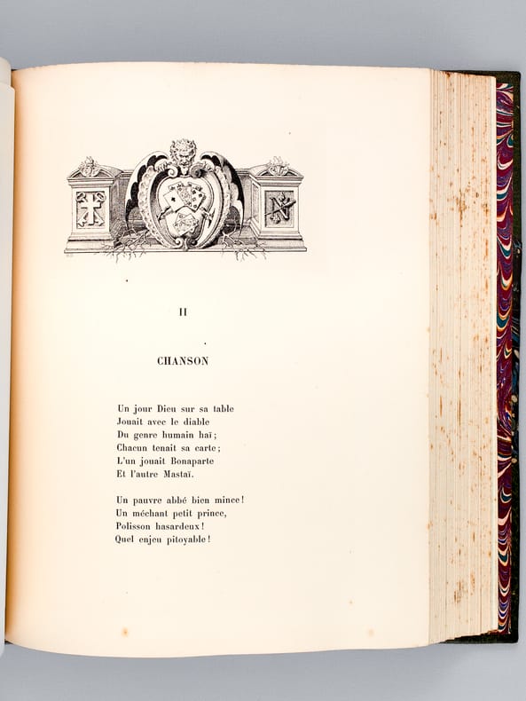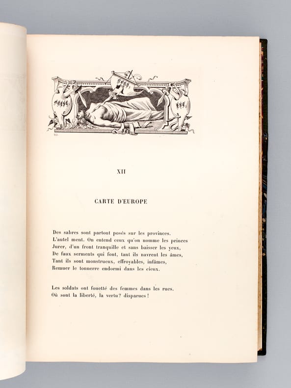 [Jersey], Imprimerie universelle, (2 décembre) 1852 1 vol. (70 x 110 mm) de 16 p. Demi-maroquin brun, dos lisse, titre doré en long. Tiré à part, d'après une pièce extraite de l'édition non expurgée des Châtiments.