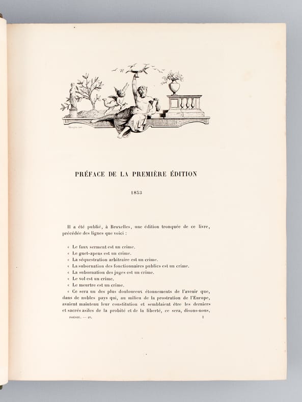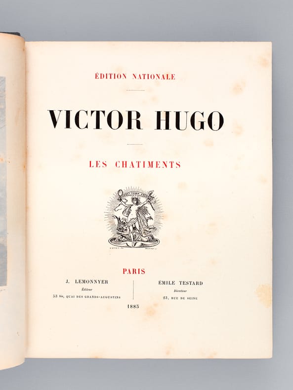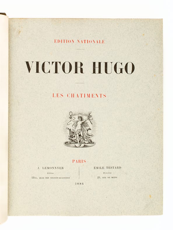 Belle édition des "Châtiments" appartenant à la célèbre "Edition Nationale", établie dans une reliure de qualité en demi-maroquin à coins. La tranche supérieure est admirablement ciselée et finement dorée. Bon état (dos passé, très bon état par ailleurs). Vicaire, IV, 421