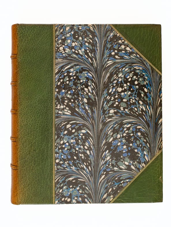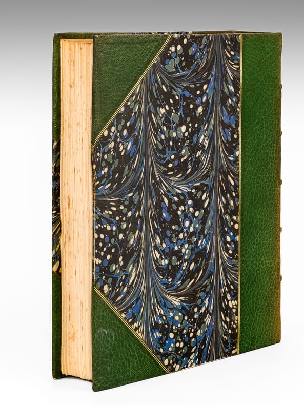 1 vol. fort in-4 reliure de l'époque demi-maroquin à coins vert, dos à 5 nerfs, double filet doré en mors et coins, tranche sup. dorée et finement ciselée, couverture conservée, Edition Nationale, J. Lemonnyer, Emile Testard, Paris, 1885, 2 ff., 478 pp., 1 f. n.ch. avec 5 planches hors texte (eaux-fortes) Par Bracquemond, Champollion, Flameng, etc.. avec vignettes dans le texte