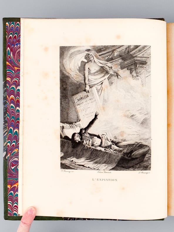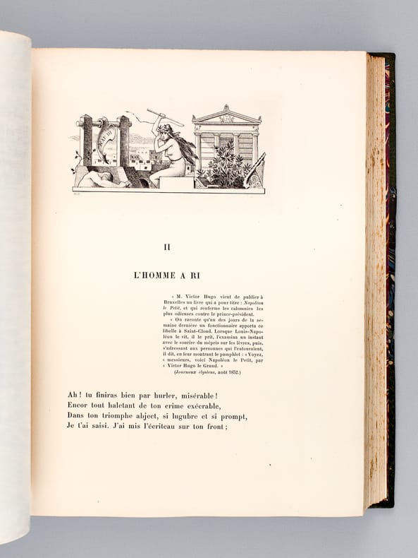 Edition complète des Châtiments, seule reconnue par l'auteur, de ce recueil de poèmes satiriques contre Napoléon III. La page de titre des Châtiments ne comporte pas la date de 1853, sans doute une contrefaçon. Rare édition parue un an après l'édition originale de "Napoléon-le-Petit", non répertoriée par Carteret ni Vicaire. Dans une lettre adressée à l'éditeur Pierre-Jules Hetzel, datée du 7 septembre 1852 et dans laquelle il lui annonce la rédaction des Châtiments pour dénoncer le coup dÉtat de Napoléon III, Victor Hugo écrit : « J'ai pensé qu'il m'était impossible de publier en ce moment un volume de poésie pure. Cela ferait l'effet d'un désarmement, et je suis plus armé et plus combattant que jamais ». Ces deux ouvrages ne rapportèrent pas de revenu à leur auteur : "Napoléon-le-Petit et Les Châtiments, livres de combat, avaient été vendus sous le manteau, au seul bénéfice des colporteurs". (Maurois). Carteret, Vicaire.