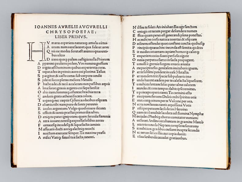 Rare exemplaire de l'édition originale. Notre exemplaire est complet de l'errata, imprimé au verso du colophon. Né à Rimini vers 1454, mort vers 1537, Jean Aurèle Augurelli "était un alchimiste et poête de talent. C'est à lui, dit-on, que le Pape Léon X offrit, en retour de la dédicace de son poëme "De Chrysopoeia" une grande bourse vide, pour qu'il pût y renfermer l'or qu'il savait créer" (Caillet et Dorbon, I, 535). Etat très satisfaisant (reliure frottée avec manques en dos et plats restaurés au XIXe, très belle fraîcheur intérieure par ailleurs).Scarce copy of the first edition. Our copy is complete with its errata, printed on the verso of the colophon. Born in Rimini, Giovanni Augurelli (circa 1454-1524) was a talented alchemist and poet. It is to him, it is said, that Pope Leo X offer, in return for the dedication of his poem "De Chrysopoeia" a large empty purse, so that he could contain the gold that he knew how to create ! The "Chrysopœia"presents an alchemical interpretation of Greco-Latin mythology. Rubbed binding with small lack on the spine, covers restored in the 19th century, very nice interior freshness otherwise. Ferguson, I, 56 ; STC Italian, I, 61
