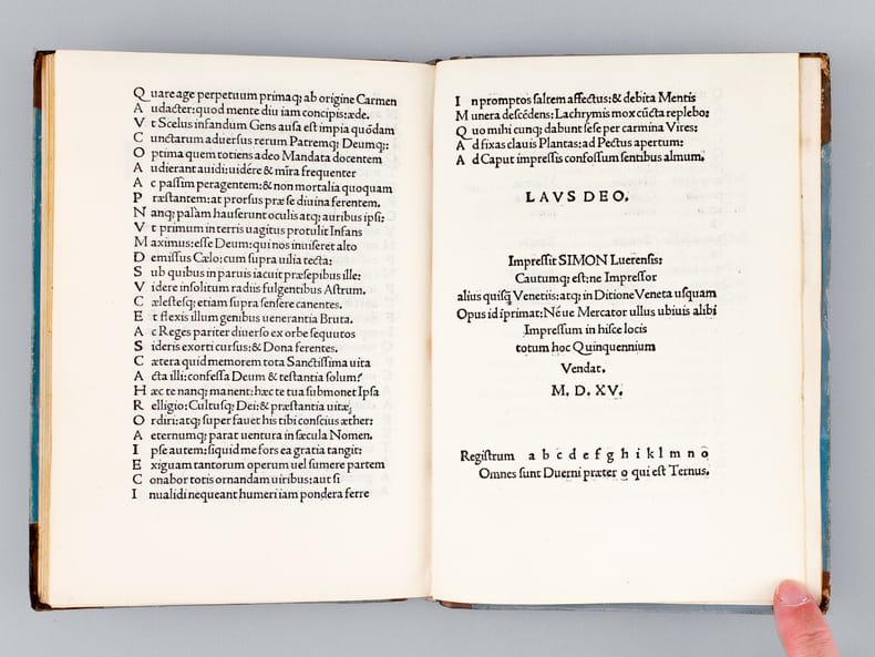 1 vol. in-4 (20,45 x 14,3 cm en marges) reliure XVIIIe restaurée en plat postérieurement, dos lisse muet, Impressit Simon Luerensis [ Simone da Lovere ], Venetiis [ Venezia ; Venise ], 1515, 57 ff.