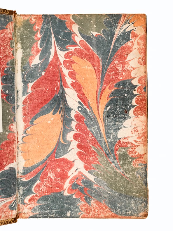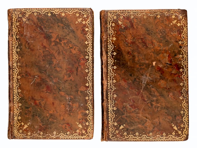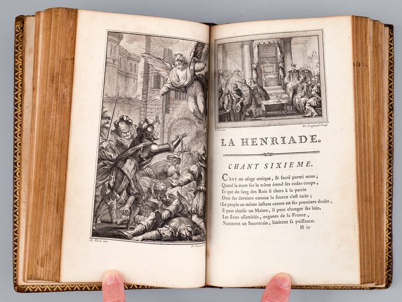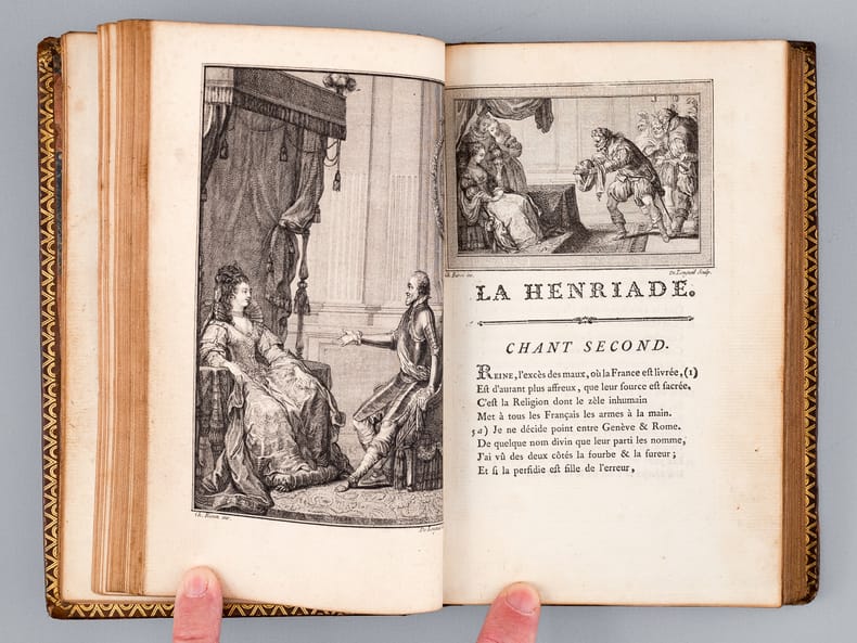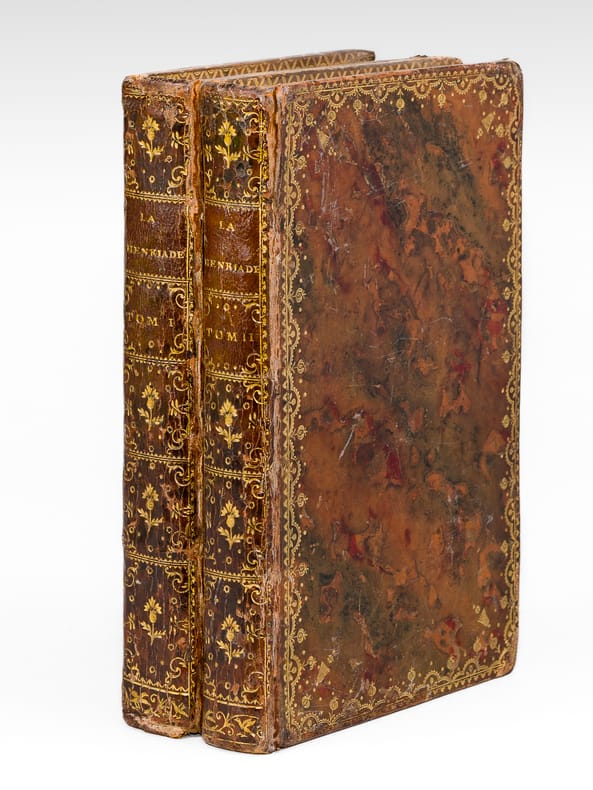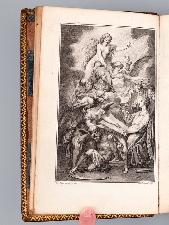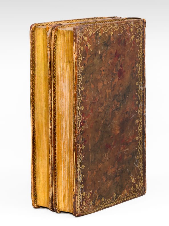 Nouvelle édition, 2 vol. in-8 reliure de l'époque plein veau porphyre, dos lisse richement orné, filets et roulette dorés d'encadrement en plats, coupes et chasses ornées, toutes tranches dorées, Chez la Veuve Duchesne, Saillant, Desaint, Panckoucke et Nyon (De l'Imprimerie de Barbou), [ 1769 ] - 1770, 1 f. (titre gravé), XL-272 pp. avec 1 frontispice et 10 figures hors texte avant la lettre et 10 vignettes ; 1 f. blanc, 316 pp. et 2 ff n. ch.
