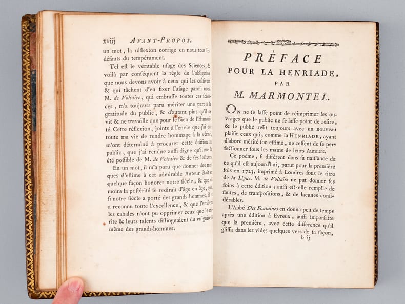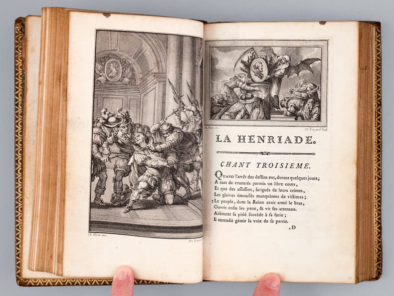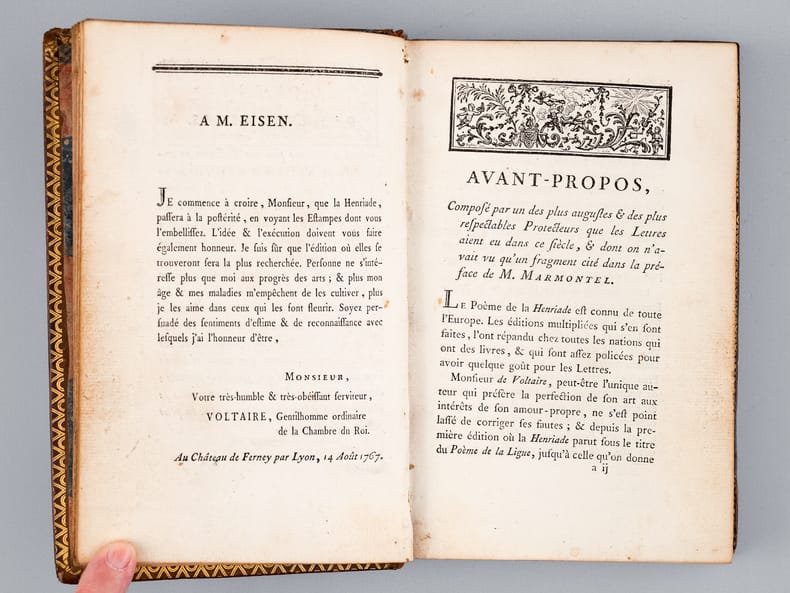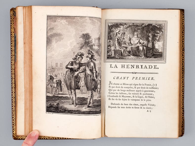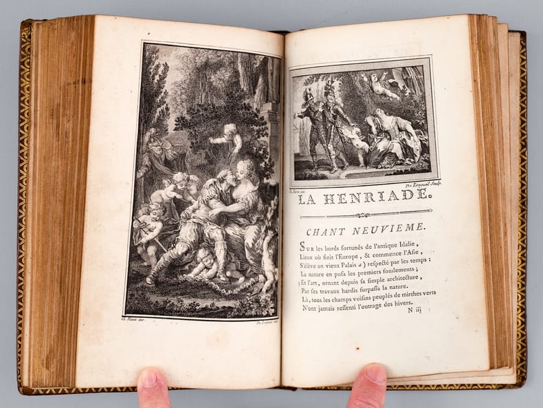 Rare exemplaire de cette célèbre édition, avec les 10 vignettes et surtout les 10 figures hors texte dessinées par Eisen et gravées par Longueil, dans leur tirage avant la lettre ! La suite seule des 10 figures avant la lettre s'était vendue 58 francs en 1878 à la vente R. Portalis. Etat très satisfaisant (reliure un peu frottée avec usures en mors, coiffes et coins, qq. rouss. et rares petites mouill., bon état par ailleurs, ex-libris en garde). Cohen & Ricci, II, 1026 ; Bengesco, I, 384