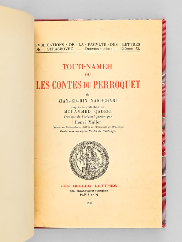 De Ziay-Ed-Din Nakchabi d'après la rédaction de Mohammed Qaderi, Traduits de l'original persan par Henri Muller, 1 vol. petit in-8 reliure demi-basane rouge, dos à 2 nerfs, couverture conservée, Publications de la faculté des Lettres de Strasbourg, Les Belles Lettres, 1934, XXV-124 pp.