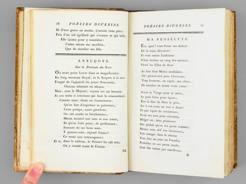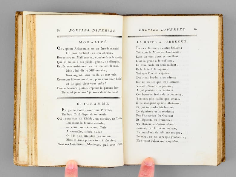 La petite renommée du poète Claude-Marie Guyétand (1748-1811) serait peut-être une source d'inspiration de Stendhal pour le personnage de Julien Sorel ; la vie de Guyétand a en effet de nombreux points communs avec celle du héros du Rouge et le Noir". Etat très satisfaisant (usures en coins et petits travaux de vers au mors en queue, bon état par ailleurs, ex-libris en garde).