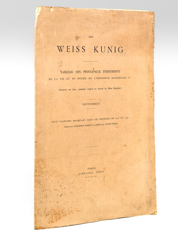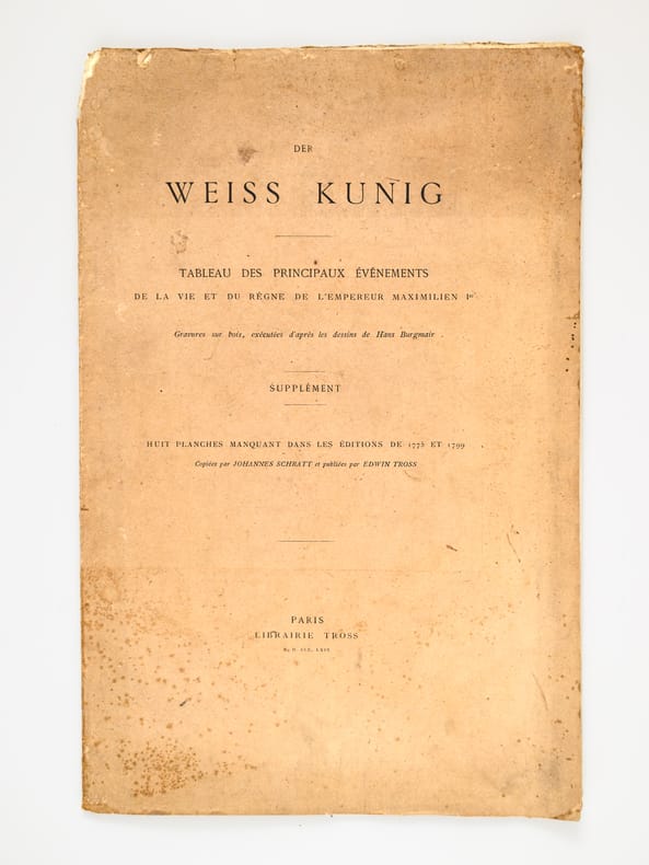 Copiées par Johannes Schratt et publiées par Edwin Tross, 1 vol. in-folio en feuillets sous couverture, Librairie Tross, Paris, 1869, 1 f. blanc double (sous-chemise), 1 f. double (texte) et 8 planches. Rappel du titre complet : Der Weiss Kunig. Tableau des Principaux Evénements de la Vie et du Règne de l'Empereur Maximilien Ier. Gravures sur Bois, exécutées d'après les dessins de Hans Burgmair. Supplément. Huit planches manquant dans les éditions de 1775 et 1799