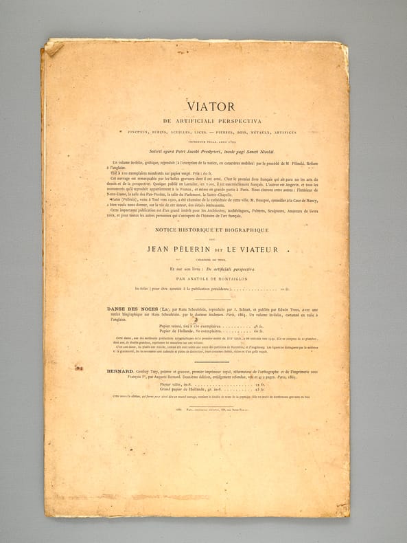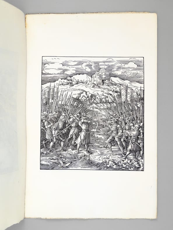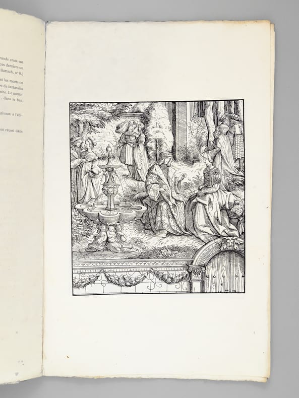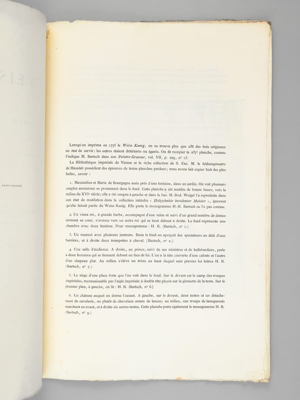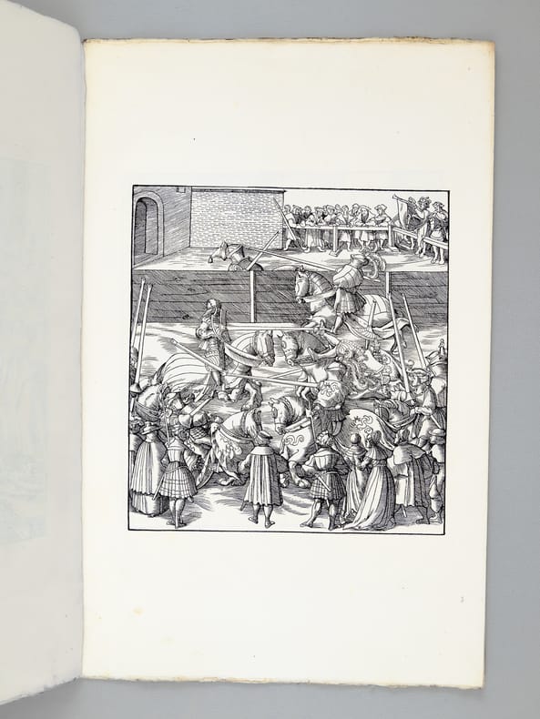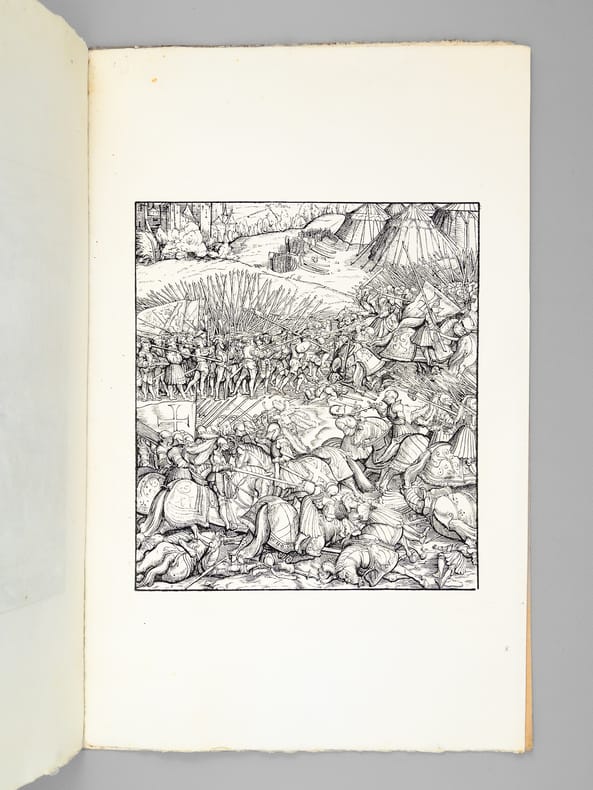 Ainsi que l'explique l'éditeur Edwin Tross, "lorsqu'on imprima en 1775 le "Weiss Kunig", on ne trouva plus que 236 des bois originaux en état de servir ; les autres étaient déteriorés ou égarés. [... ] La Bibliothèque impériale de Vienne et la riche collection de S. Exc. M. le feldzeugmestre de Hauslab possèdent des épreuves de treize planches perdues ; nous avons fit copier huit des plus belles [... ]". Etat très satisfaisant (couv. frottée, petit grignotage affectant le haut de la couverture et la sous-chemise, mais n'affectant pas le feuillet double de texte ni les planches, très bon état par ailleurs).